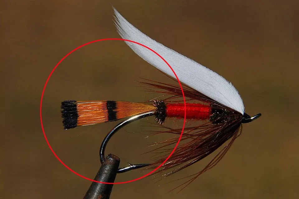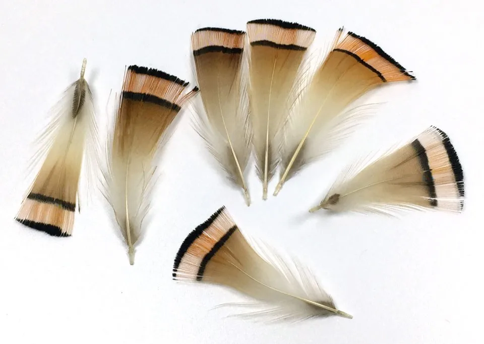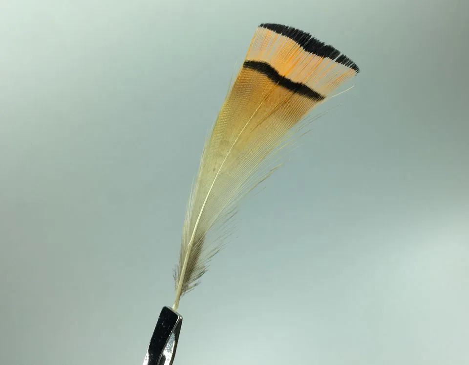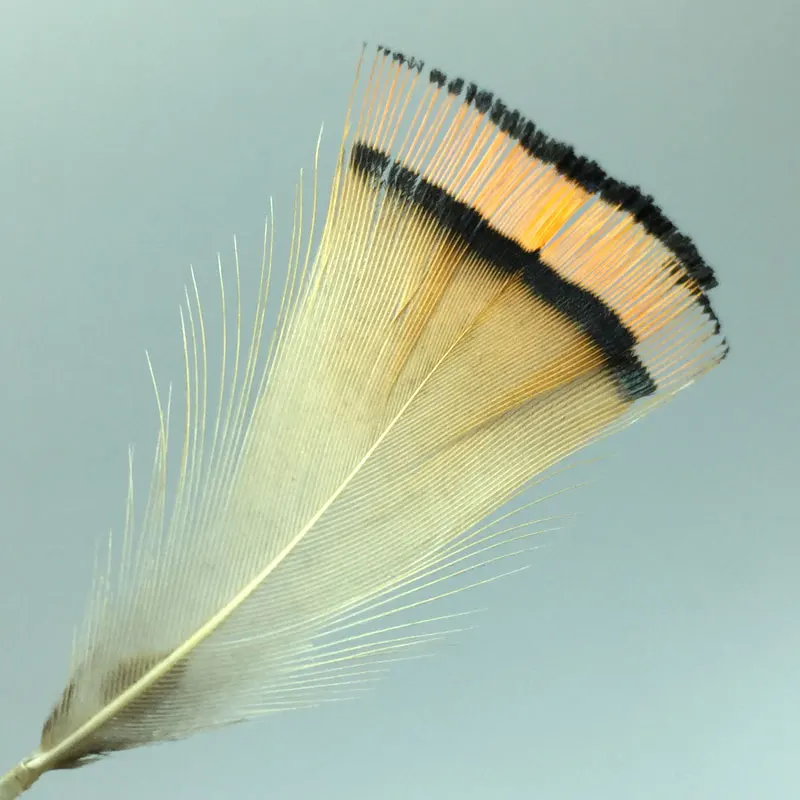 Estas plumas de tippet de naranja provienen del cuello de un temsán dorado masculino y se utilizan a menudo para atar moscas clásicas del salmón del Atlantic.También se utilizan para colas en el Royal Coachman o con patrones como el Practitioner General para nombrar algunos