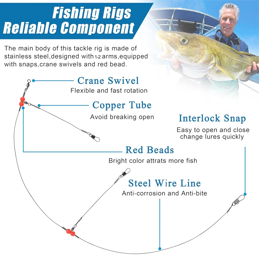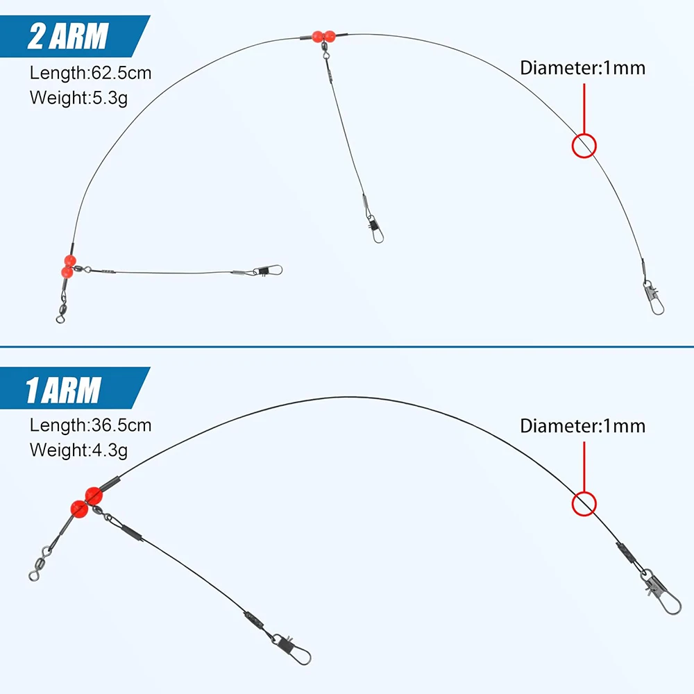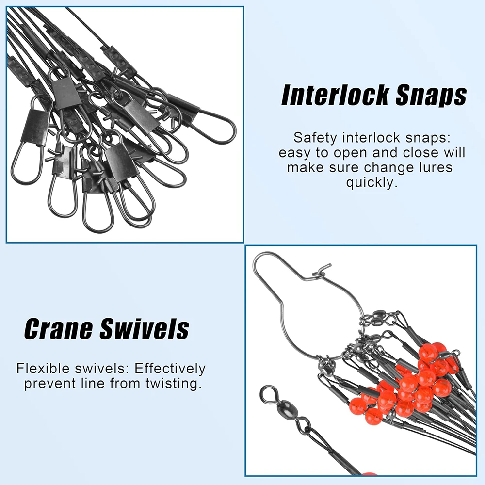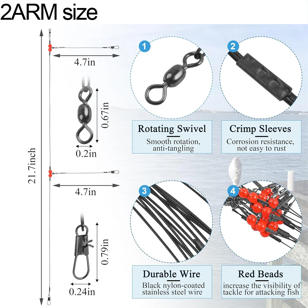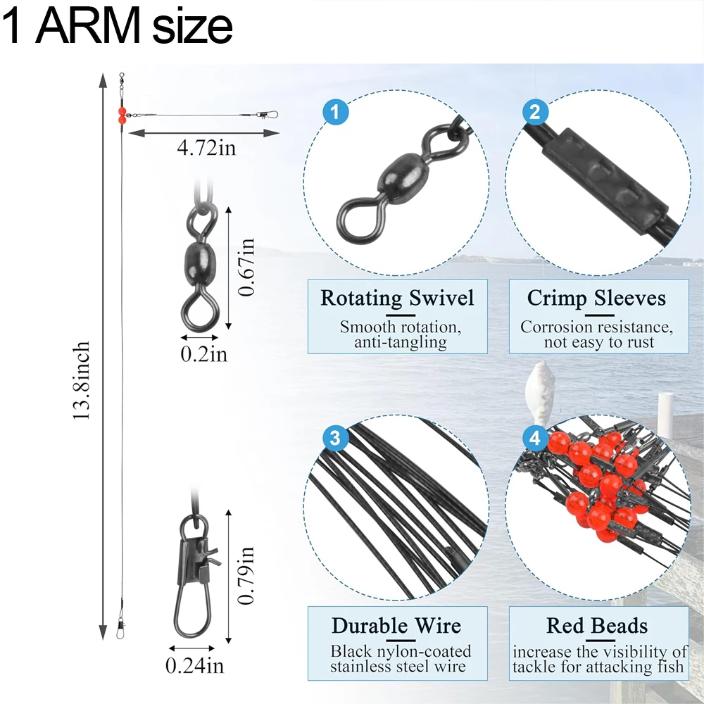 1. 12PCS stainless steel fishing wire leaders with 1arm / 2 arm, equipped with snaps, swivels and red beads.