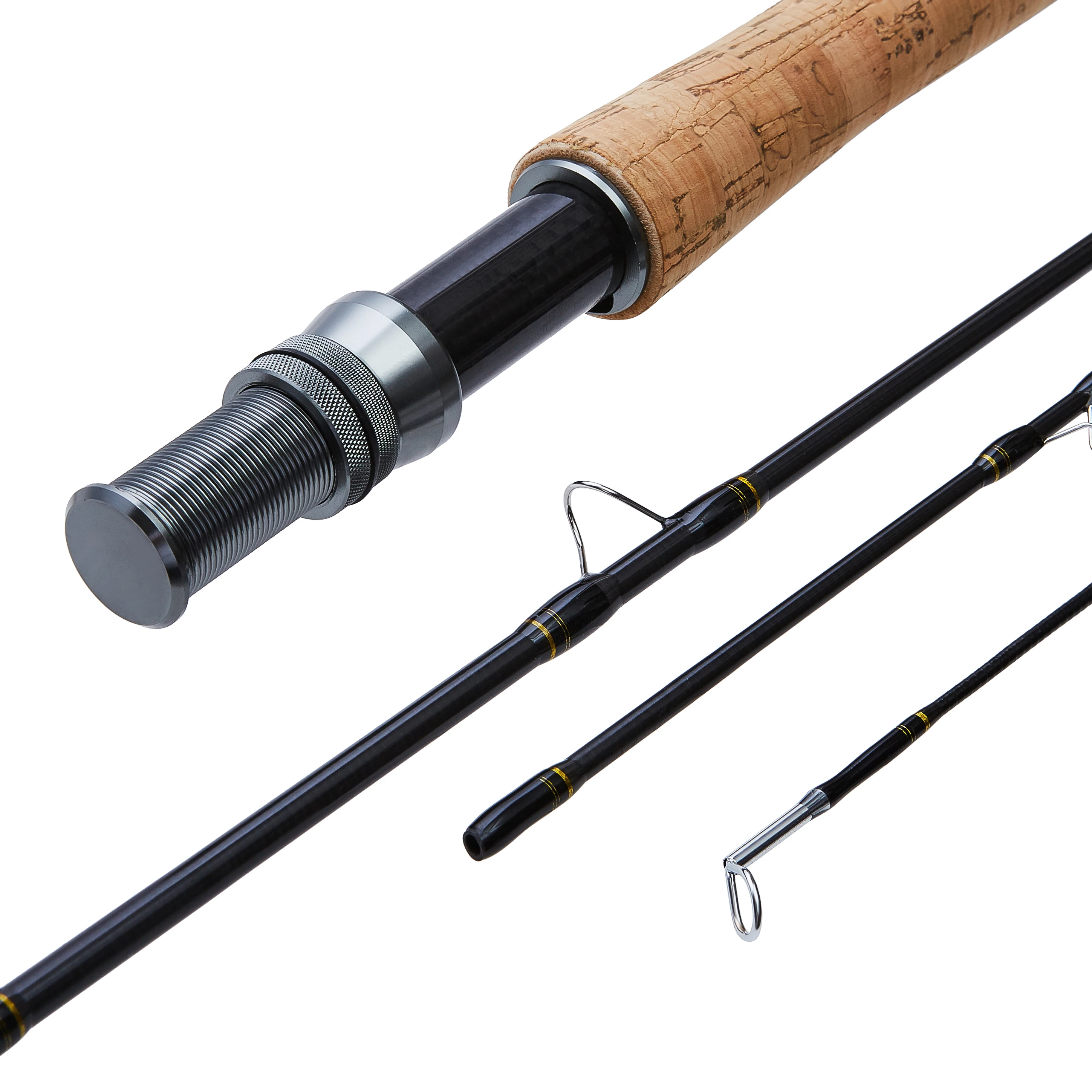 La varilla para moscas viene en 3 piezas, con asiento de carrete de aluminio y material de corcho suave en el mango.