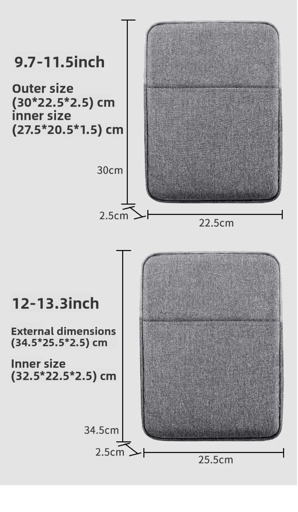 Size: 9-11.5 inch (30*22.5*2.5cm(11.81*8.86*0.98in)); 12-13.3 inch (34.5*25.5*2.5cm(13.58*10.04*0.98in))