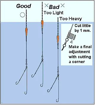 Conecte un flotador a la línea fijándolo con simples tapones de goma, coloque el peso entre el flotador y el gancho para colocar la báscula del flotador hacia la posición profunda derecha.