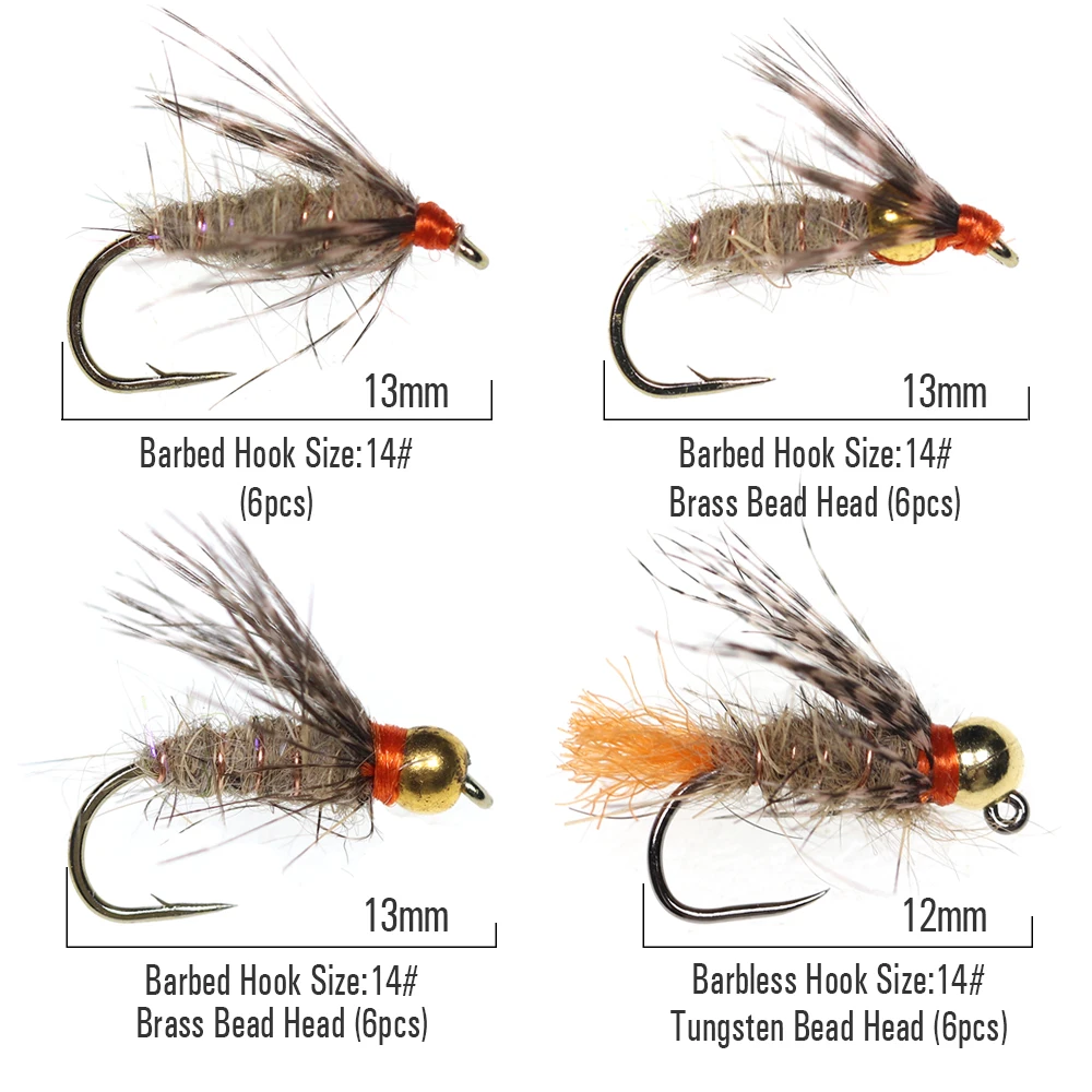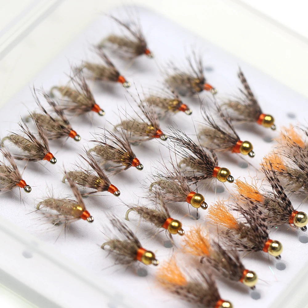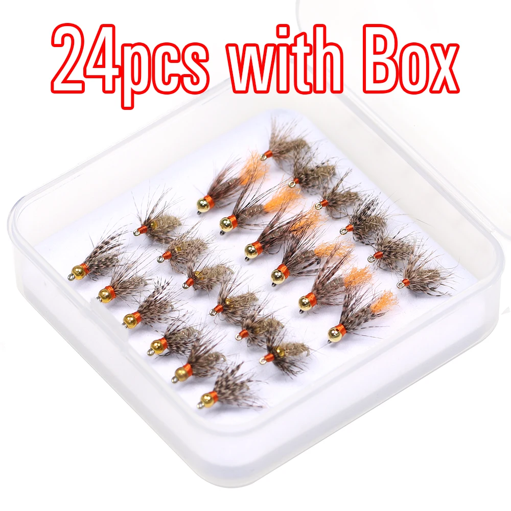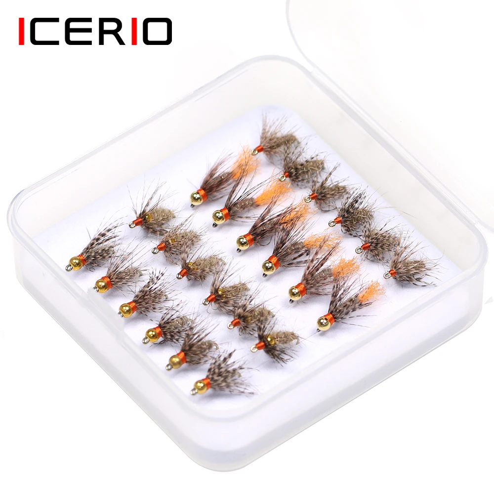 ICERIO 24 unids/caja Tungsteno/cabeza de cuenta de latón suave Hackle lies Ear Fly Mayfly Emerger Nymphs trucha pesca mosca cebo