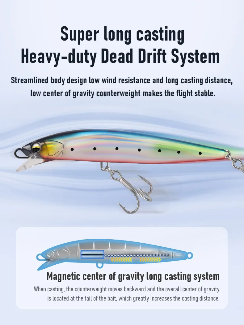 -Al lanzar, el contrapeso se mueve hacia atrás, el centro de gravedad también se mueve hacia la cola del cebo y aumenta la distancia de lanzamiento.