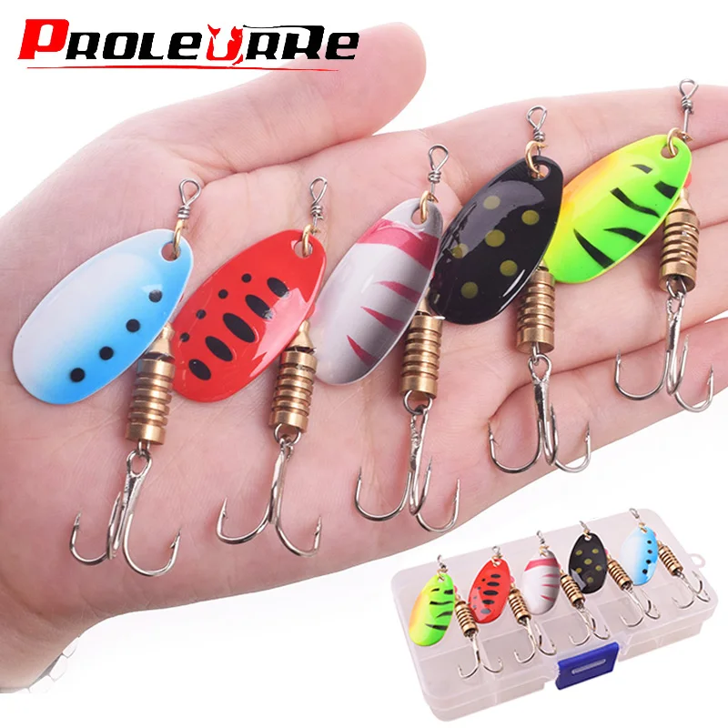 Kit de Señuelos de Pesca giratorios en caja, cebos artificiales, ganchos de Metal para peces, lubina, trucha, perca, Lucio, lentejuelas giratorias, 5 piezas