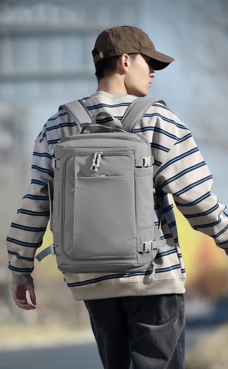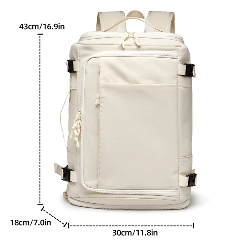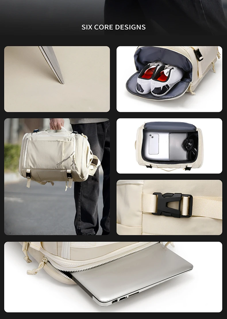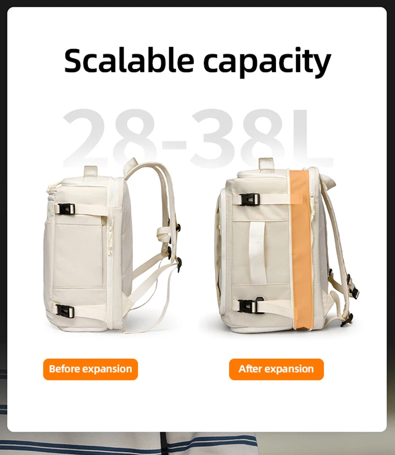 Mochila expandible de 1,28-38L con compartimento separado para zapatos, bolsillo húmedo/seco y bolsillo separado para computadora en la parte posterior.