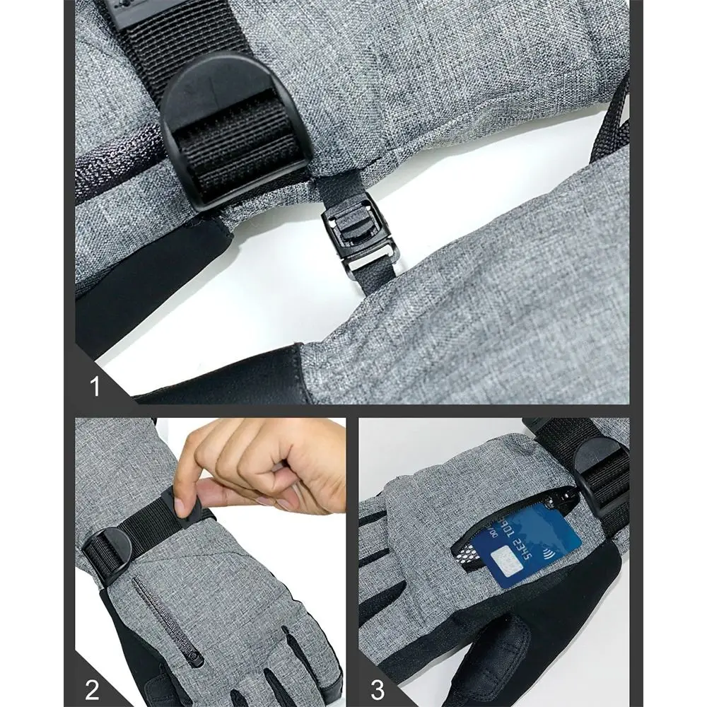 The elastic band design allows you to adjust the glove's tightness to your wrist size so snow doesn't get inside the glove. The side of the glove is designed with an elastic wrist strap, you can put the glove on your wrist when you are not wearing it to prevent it from being lost. Ski card pocket on glove for easy storage of your card