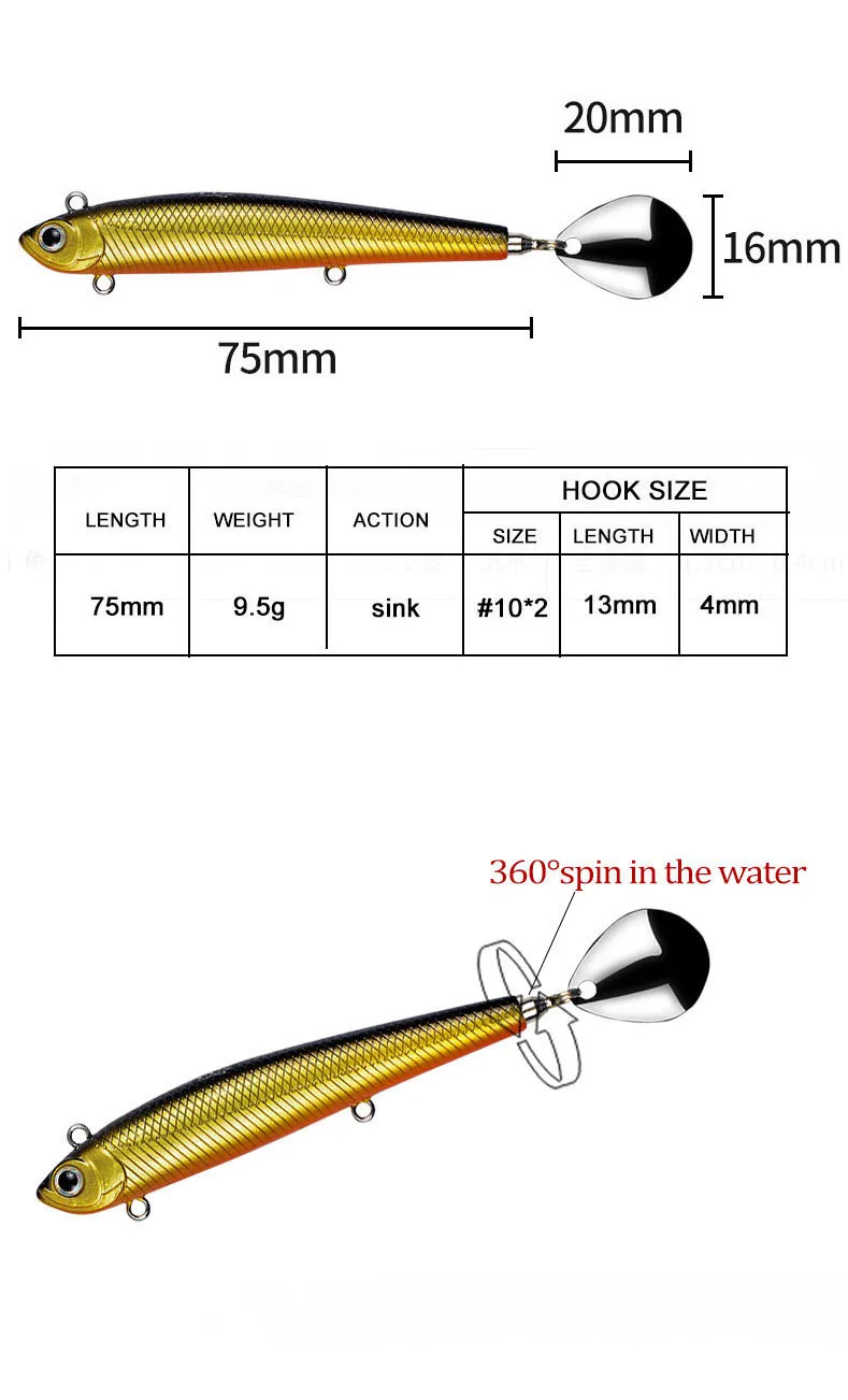 Diseño giratorio de 360 ° en la cola, con una pieza de lentejuelas de cuchara, lo que puede reflejar la luz y golpear el agua.