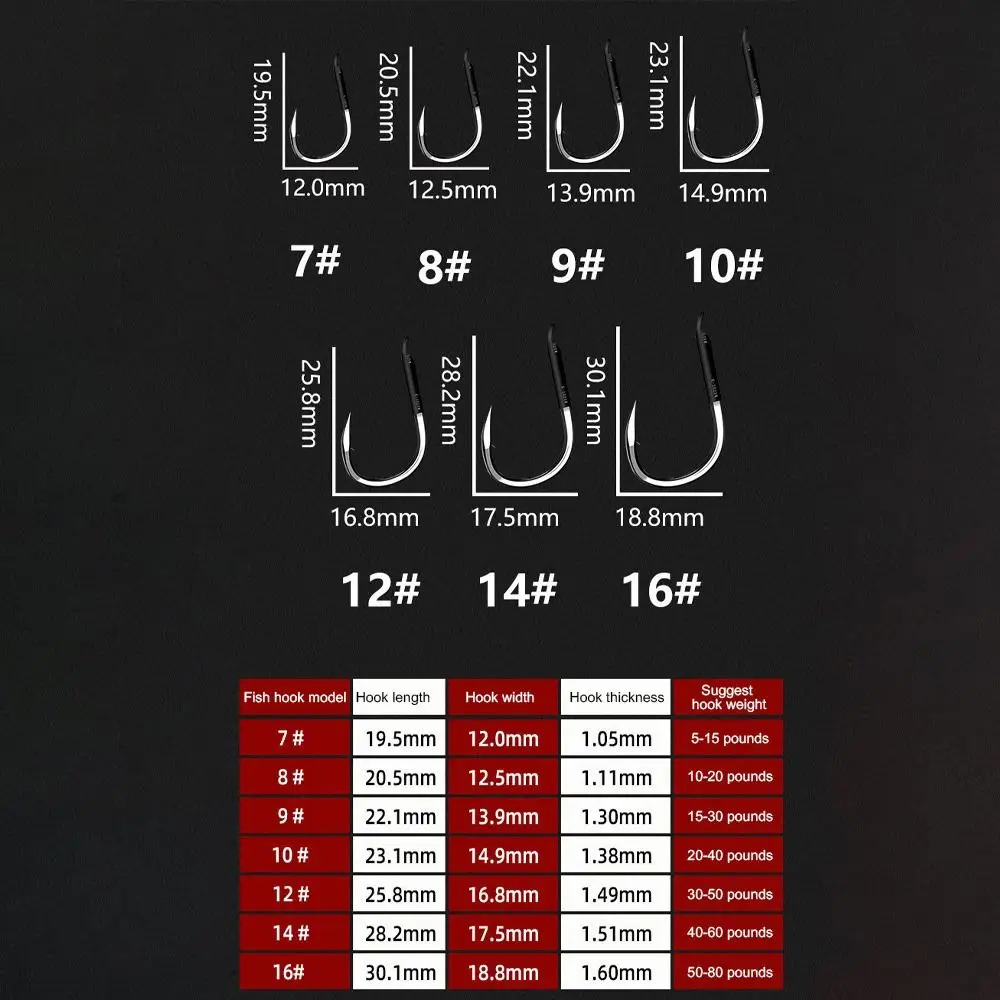 -Size:7#(20pcs)/8#(20pcs)/9#(18pcs)/10#(16pcs)/12#(14pcs)/14#(13pcs)/16#(12pcs) Packaging Quantity:1Box Barbed hook