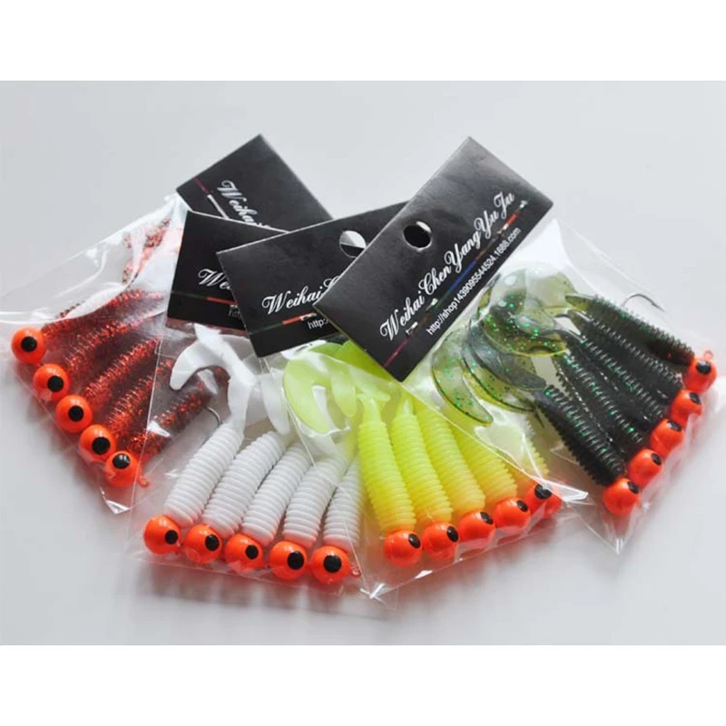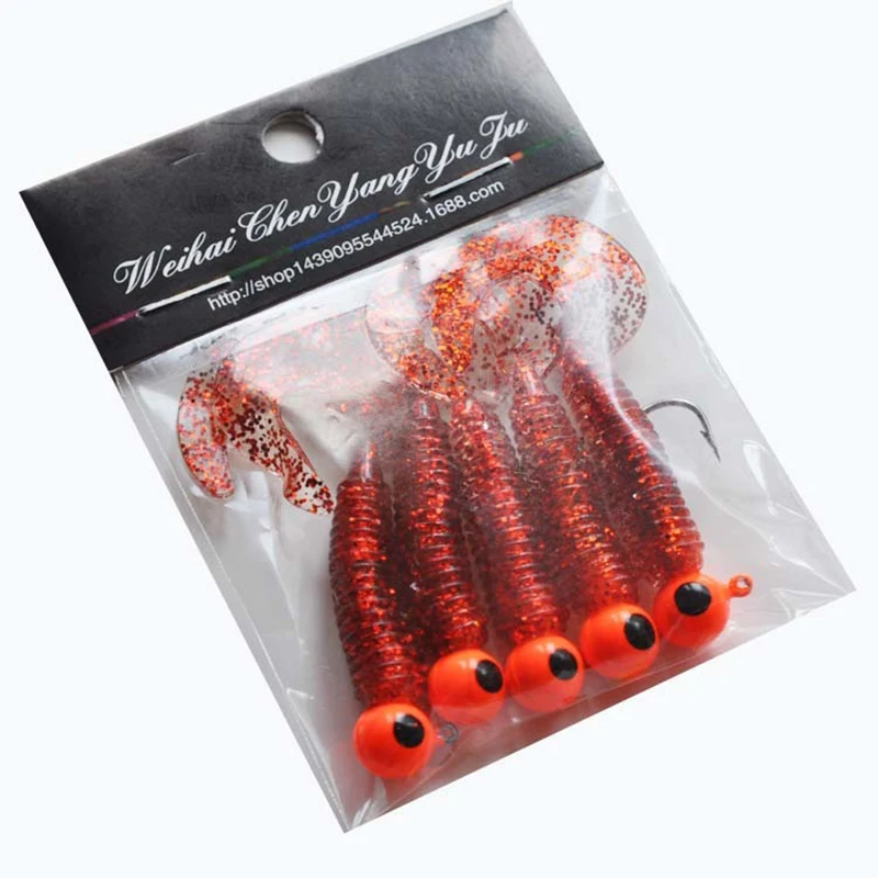 1 Juego de 5 anzuelos de plantilla, 5g, 6cm, señuelo de cola suave, gusano, aparejos de pesca de sílice, cebo de larva para aparejos de perca de pesca, cebo de silicona