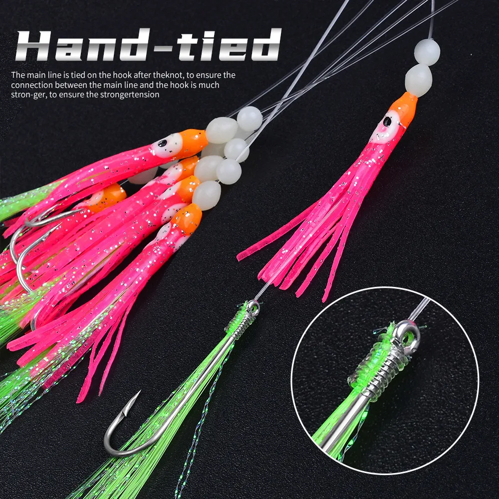 1 Juego de 6 anzuelos luminosos, plumas de caballa de pulpo, aparejos de cebo Sabiki con señuelos de cuerda, aparejos de pesca de calamar y maratón, juego de Señuelos de Pesca