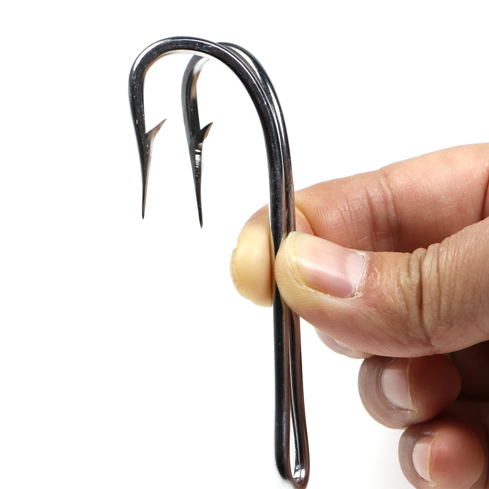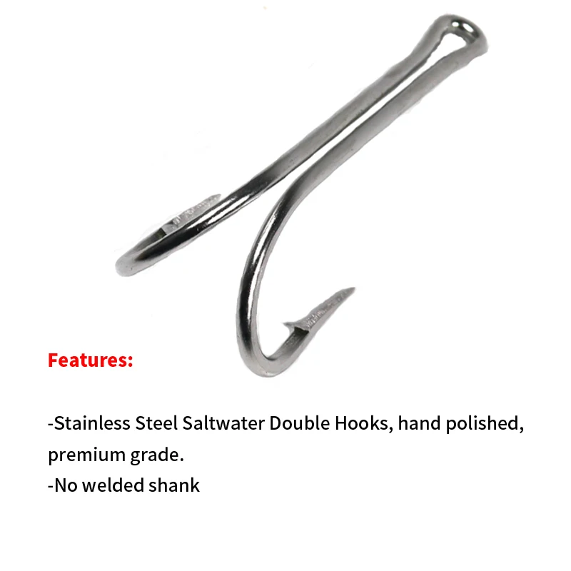 El Double Hook es una opción popular para la pesca de atún.Este fuerte gancho está hecho de alambre de acero inoxidable resistente y puede soportar abusos importantes.Con su poder de sujeción superior y su facilidad de manejo, el anzuelo de pesca doble proporciona una mejora de reemplazo ideal para señuelos y tapones de pesca con curricán.