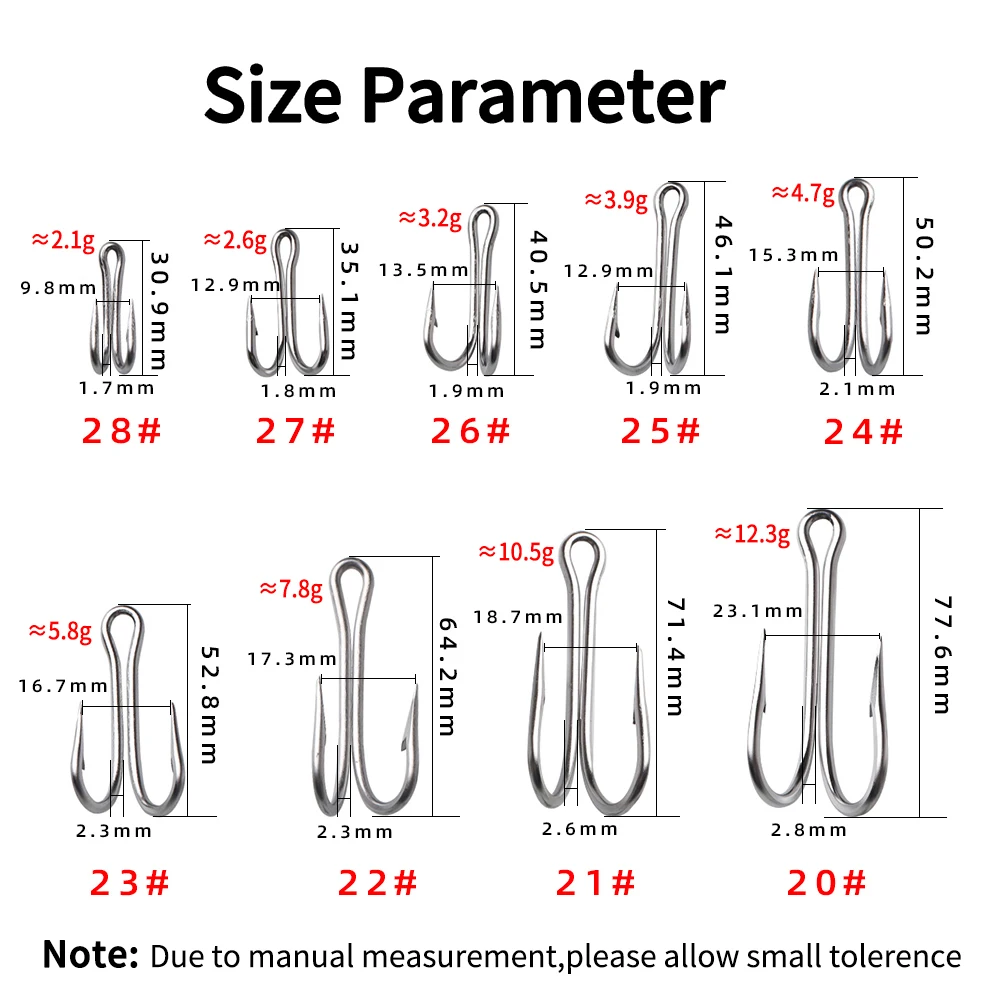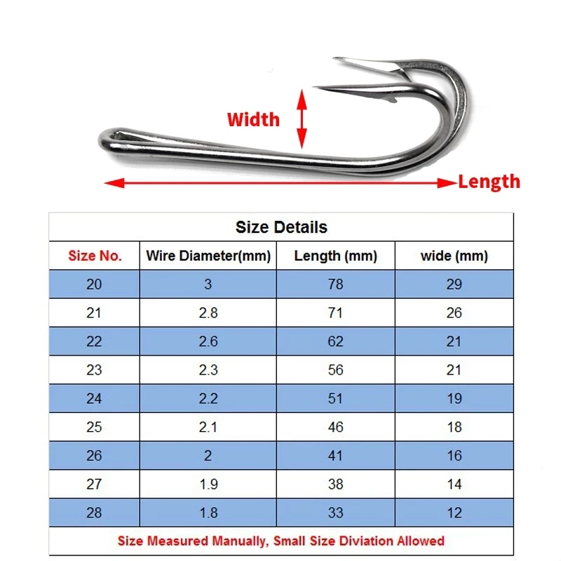 WIFREO 1 paquete#20-#28 anzuelos dobles de pesca en agua salada, anzuelo doble deportivo de rana Ray de acero inoxidable para pesca en el mar, señuelos de curricán de tiburón y atún