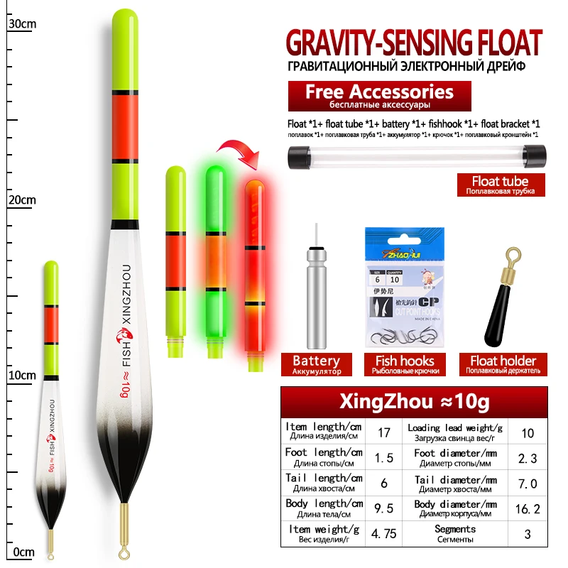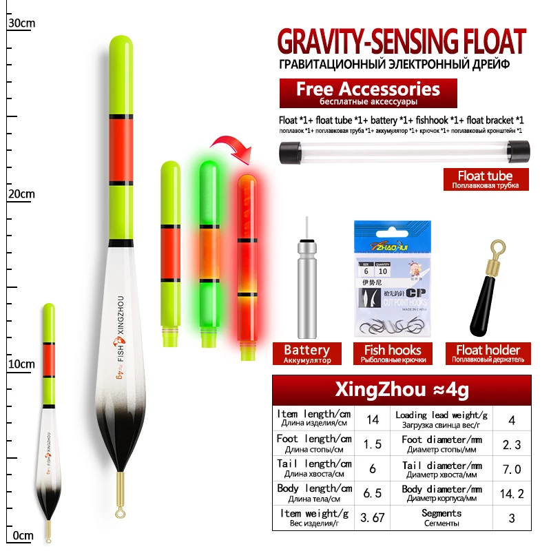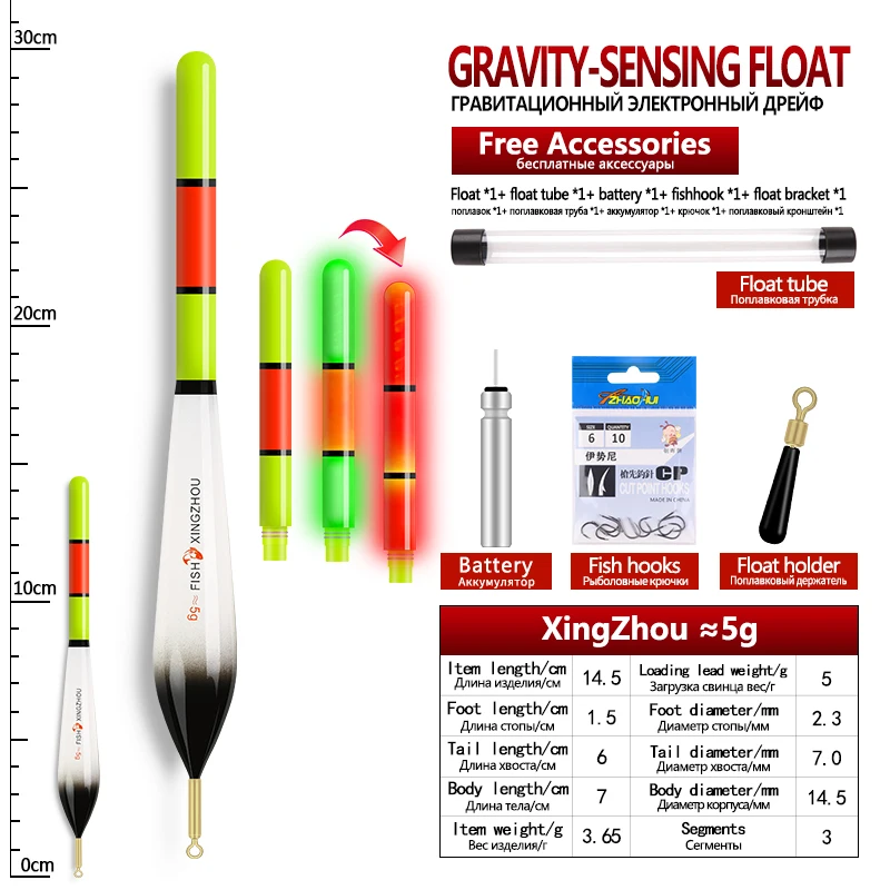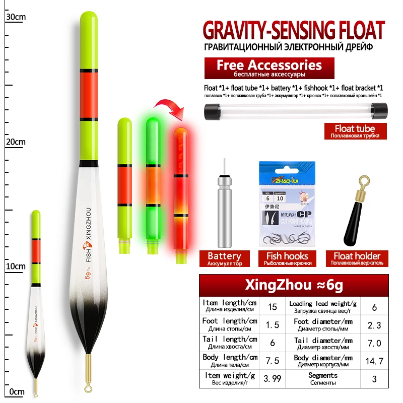 Características:1. La cola del flotador es un sensor de gravedad, que puede cambiar de color cuando el pez muerde los anzuelos de pesca.2. El flotador está hecho de nanomaterial de alta calidad, que hace que los flotadores sean duraderos para su uso.