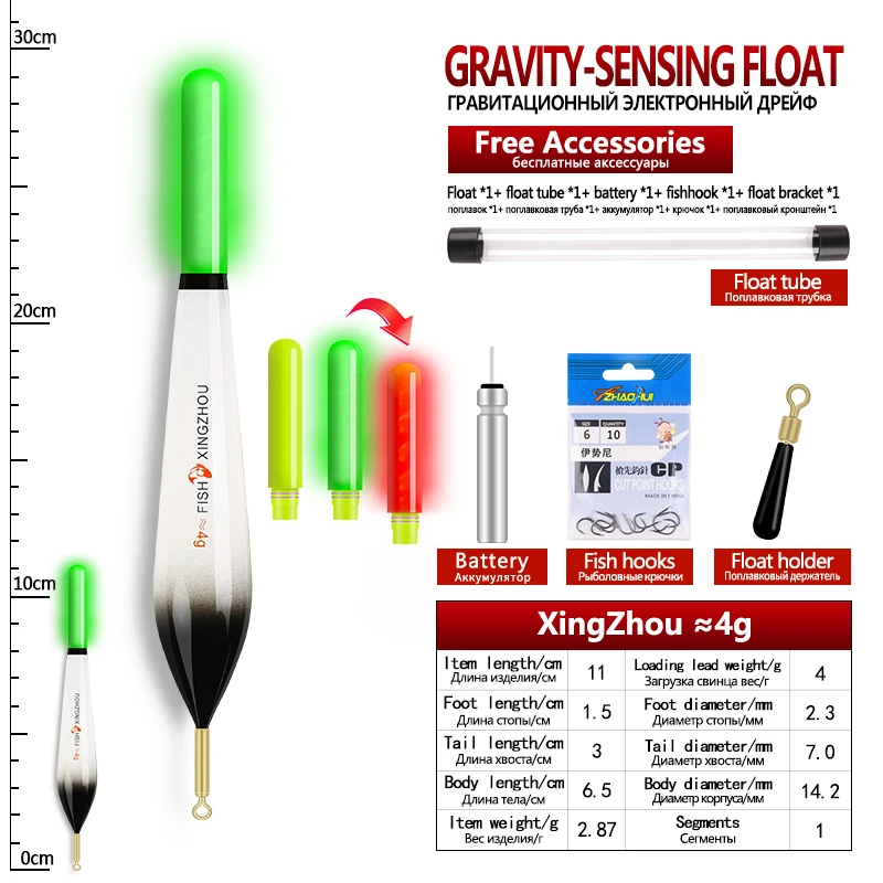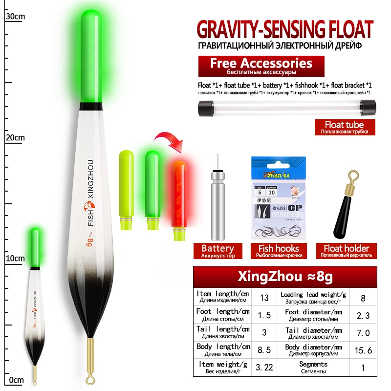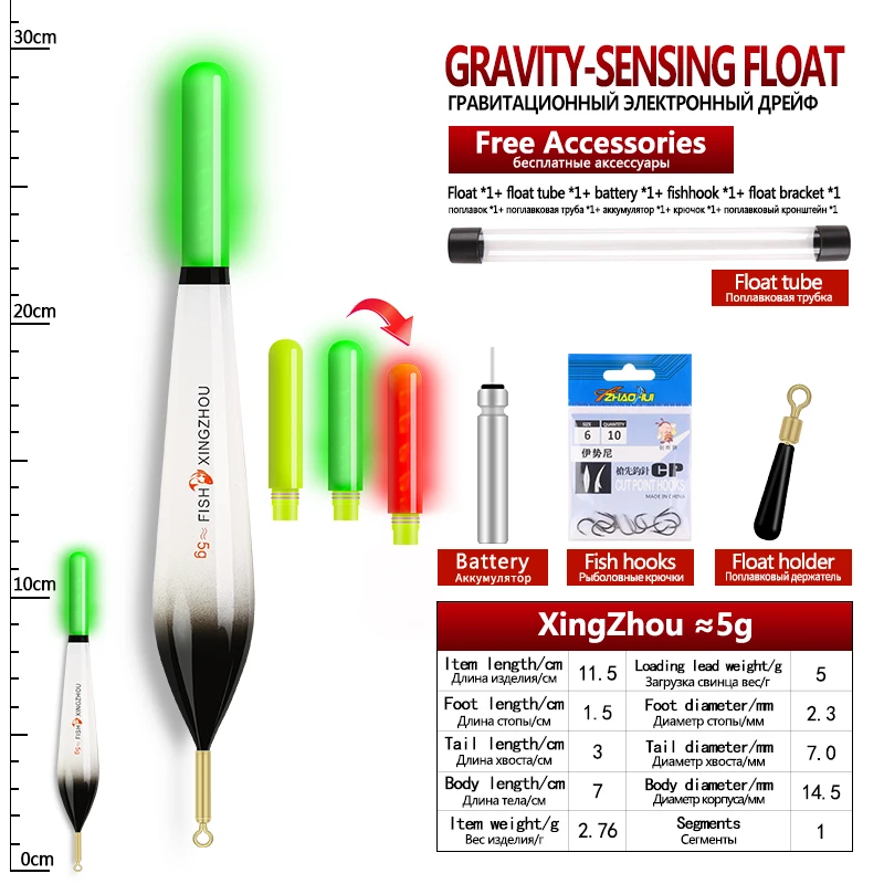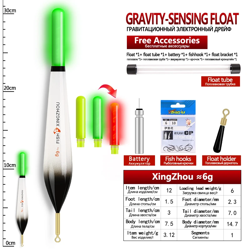Características:1. La cola del flotador es un sensor de gravedad, que puede cambiar de color cuando el pez muerde los anzuelos de pesca.2. El flotador está hecho de nanomaterial de alta calidad, que hace que los flotadores sean duraderos para su uso.