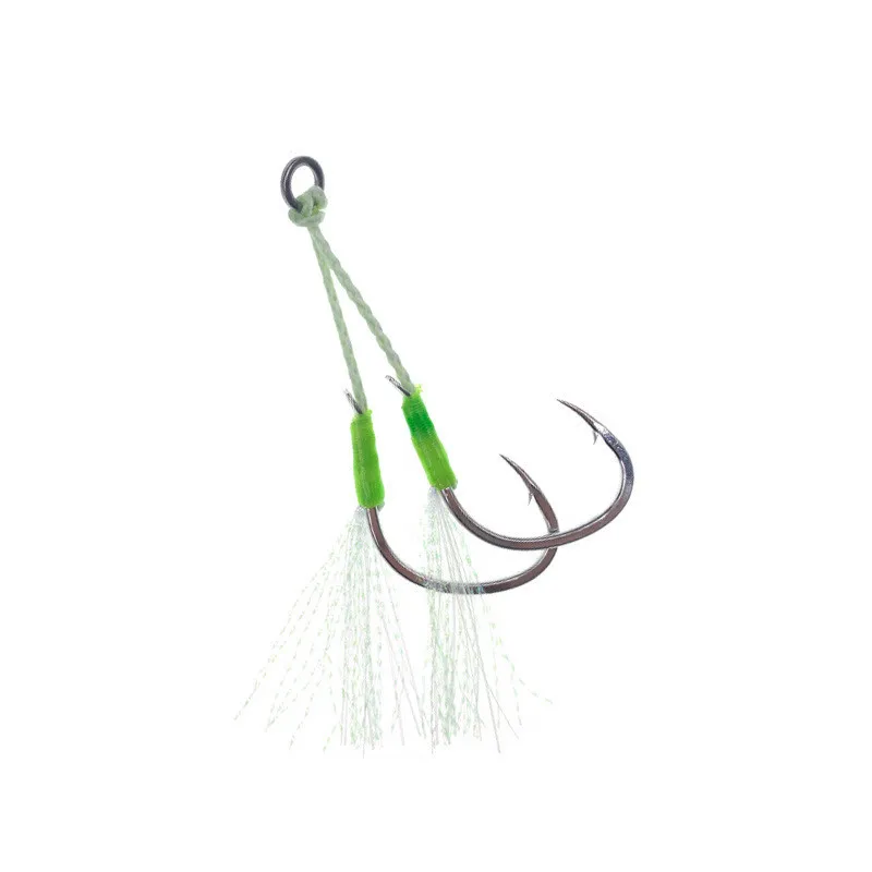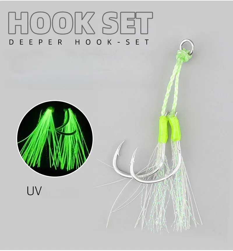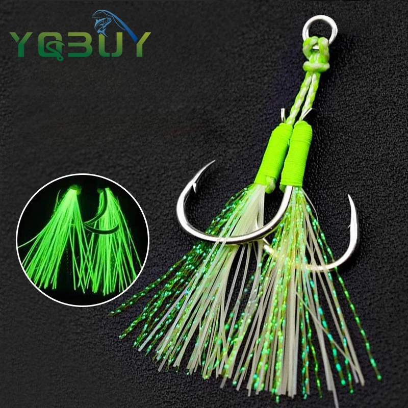 (1) Gancho de hierro doble luminoso, punta de anzuelo afilada, no es fácil de deformar, señuelo fuerte para peces.