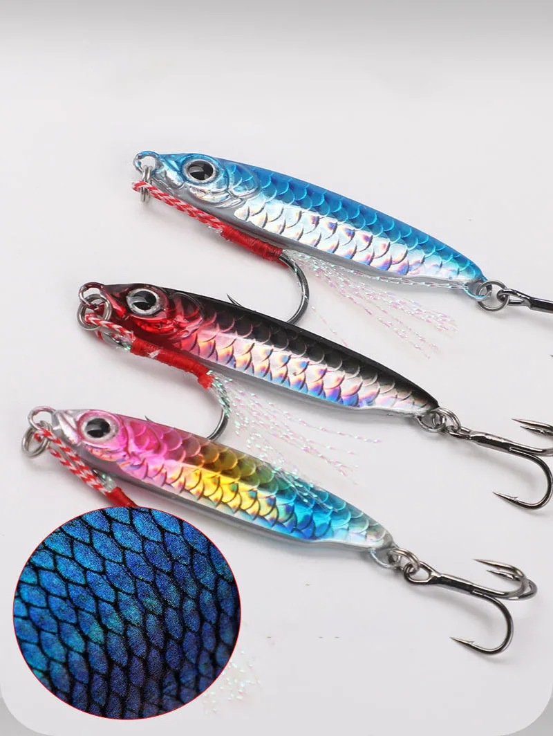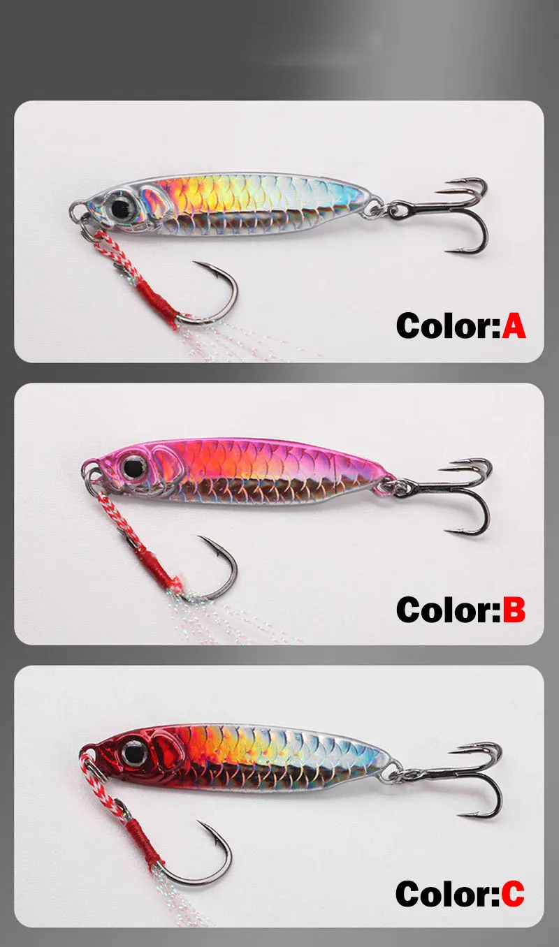 Descripción :1 Uds plantilla de Metal 7g10g 15g 20g cuchara de pesca señuelo 6 colores Iscas Artificiais plantilla de Metal señuelo rebanada Jigbait cuchara anzuelo triple Jigging