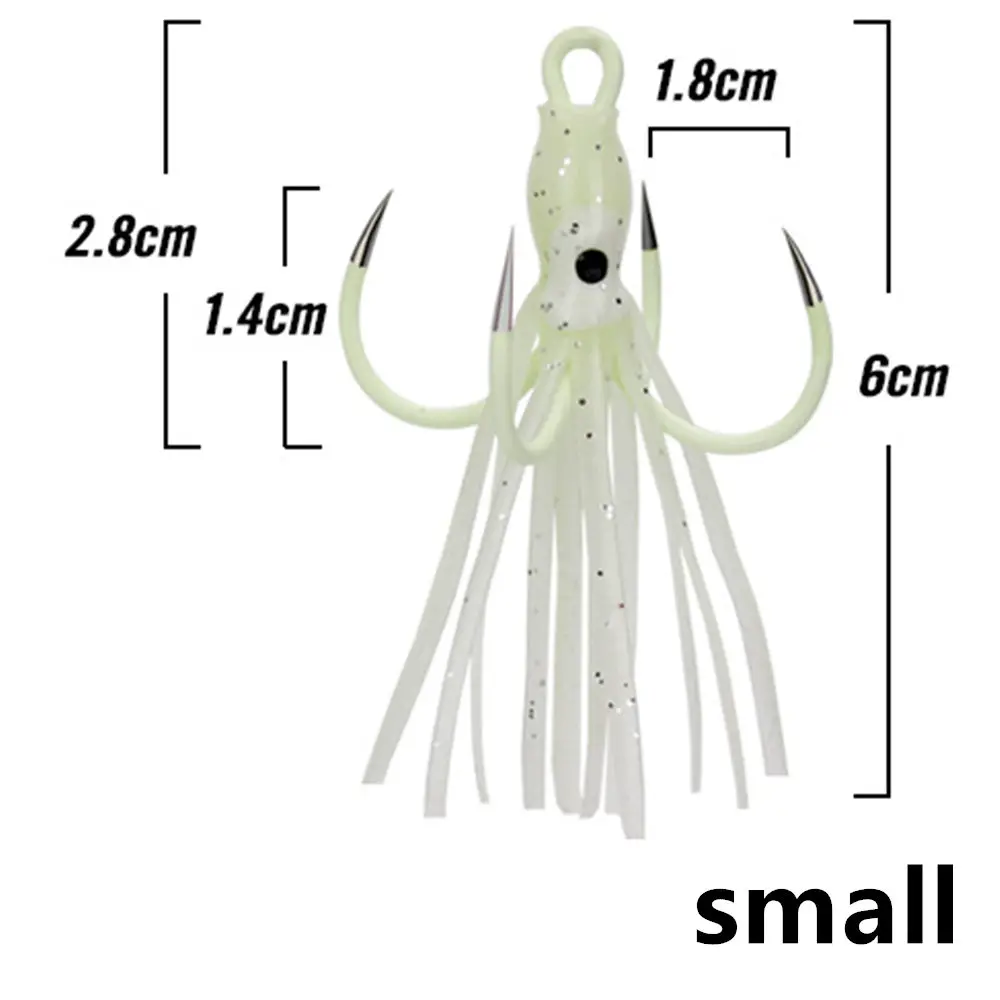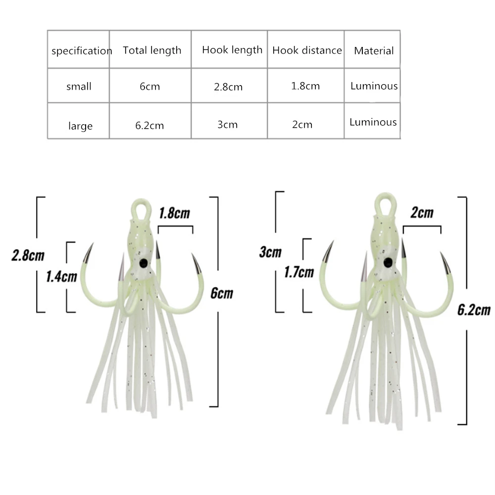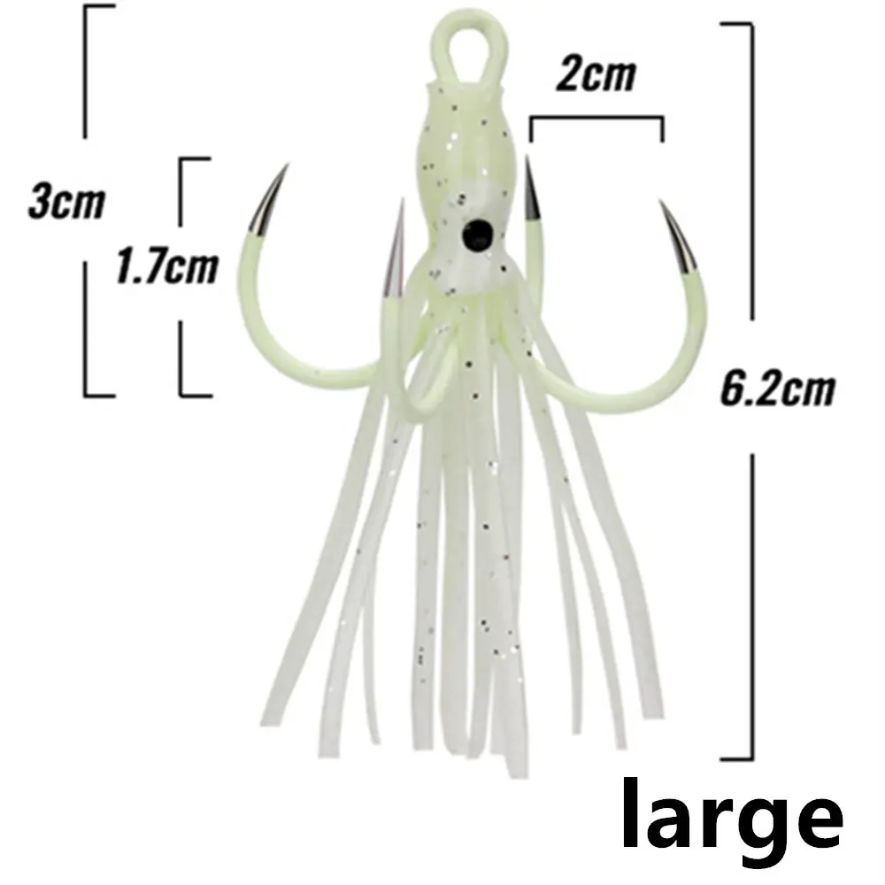 Características: Este producto es de color luminoso, con gran tamaño opcional, Arma de pesca nocturna, puede brillar en el agua, puede atraer más peces, anzuelos afilados de cuatro garras, mejor en el agua. El pez enganchado no deja que el pez viva.