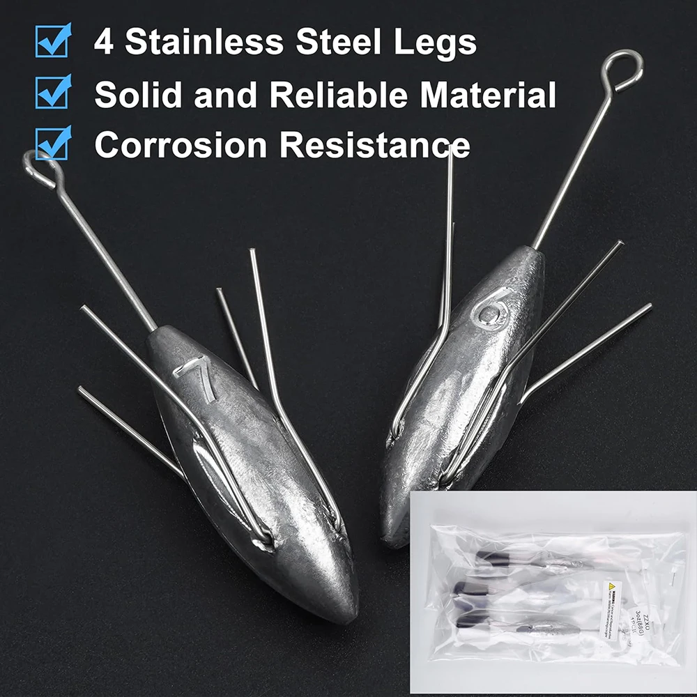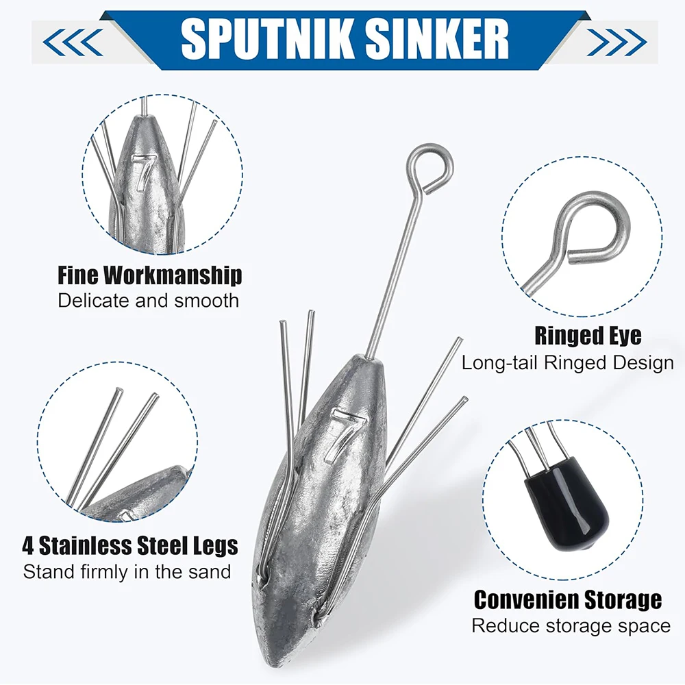 DISEÑO ÚNICO: con el diseño de 4 patas de acero inoxidable, las Plomos Sputnik pueden mantenerse firmes en la arena y sostenerse incluso en fuertes corrientes de agua, adecuadas para lanzamientos a larga distancia.