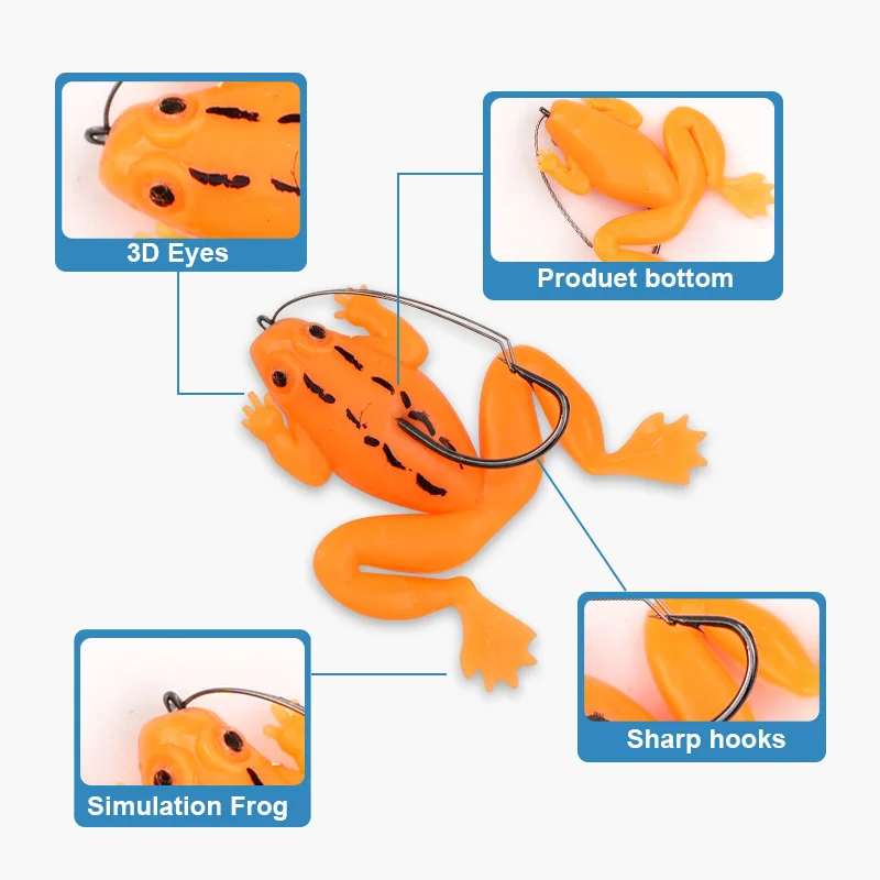 2.Materiales de primera calidad: fabricados con caucho duradero y no tóxico, estos señuelos de rana resisten el desgaste, lo que garantiza un rendimiento duradero en diversas condiciones de pesca.
