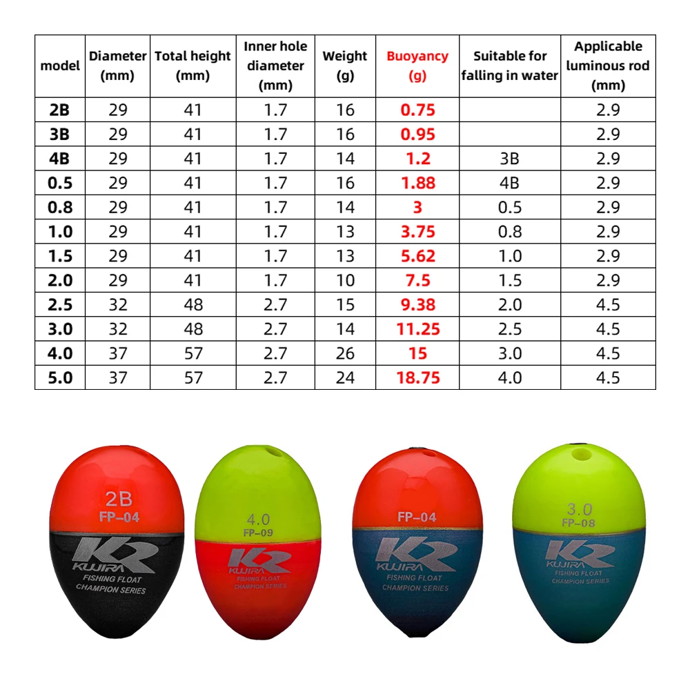 Tamaño 5,0: diámetro 37 mm, altura total 57 mm, diámetro del orificio interior 2,7 mm, peso muerto 24 g, flotabilidad 18,75 g, adecuado para gotas de agua 4,0, adecuado para barras luminosas de 4,5 mm.