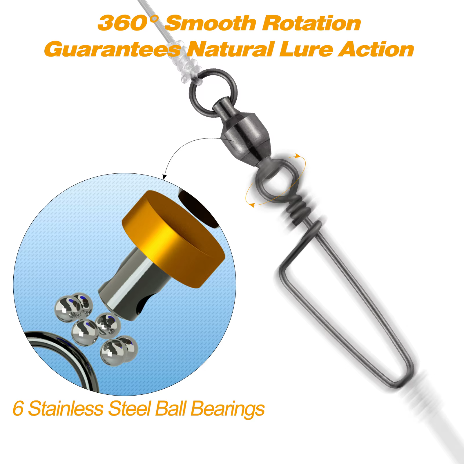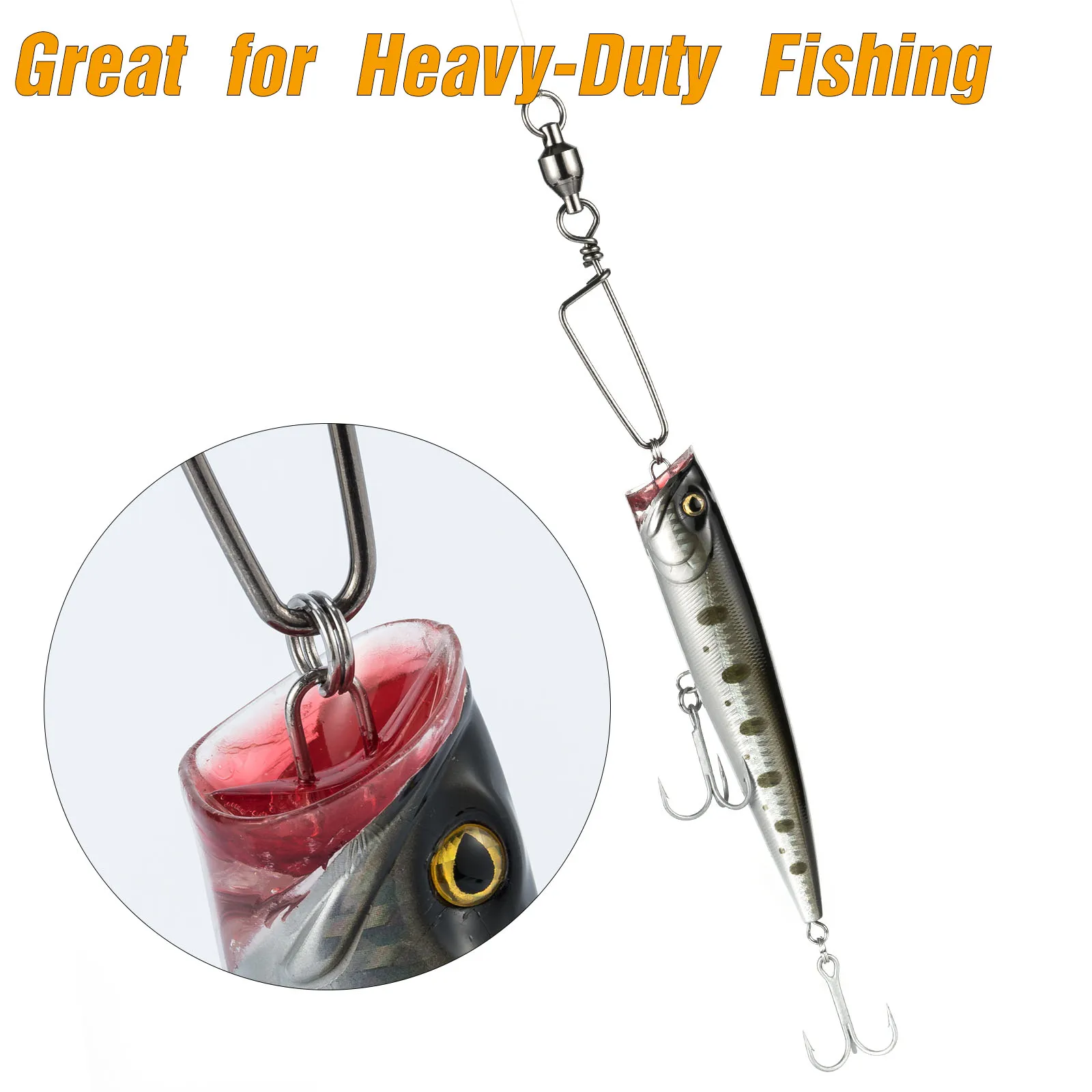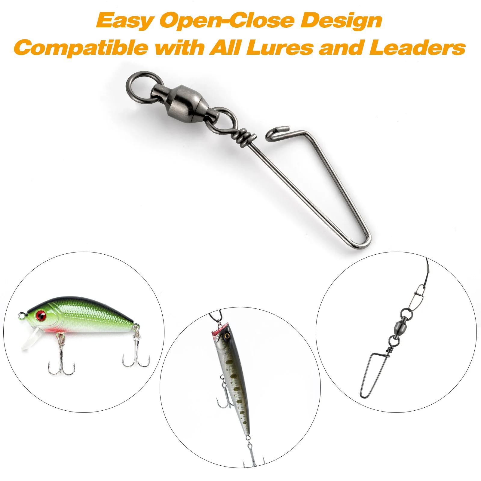 Fácil de usar:El diseño de apertura rápida le permite cambiar líderes o señuelos en segundos.Funciona para todo tipo de situaciones de pesca, desde pesca de lubina de agua dulce hasta pesca con curricán de agua salada y jigging.