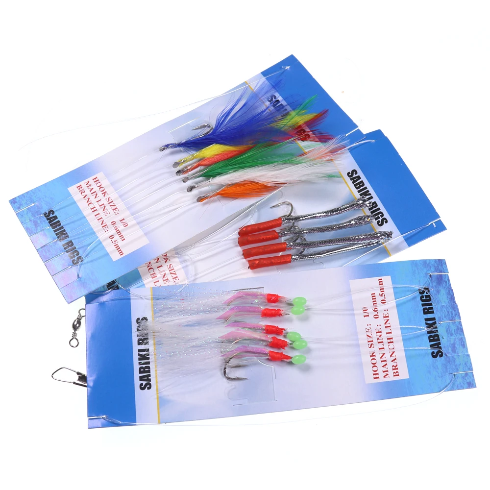 10 Bags/lot #1/0 Sea Sabiki Rigs Feather Head/ Tinsel Tube/Flash Skin High Carbon Steel Jigging Fishing Hook Lure For Herring