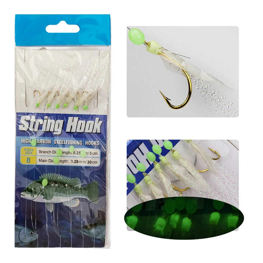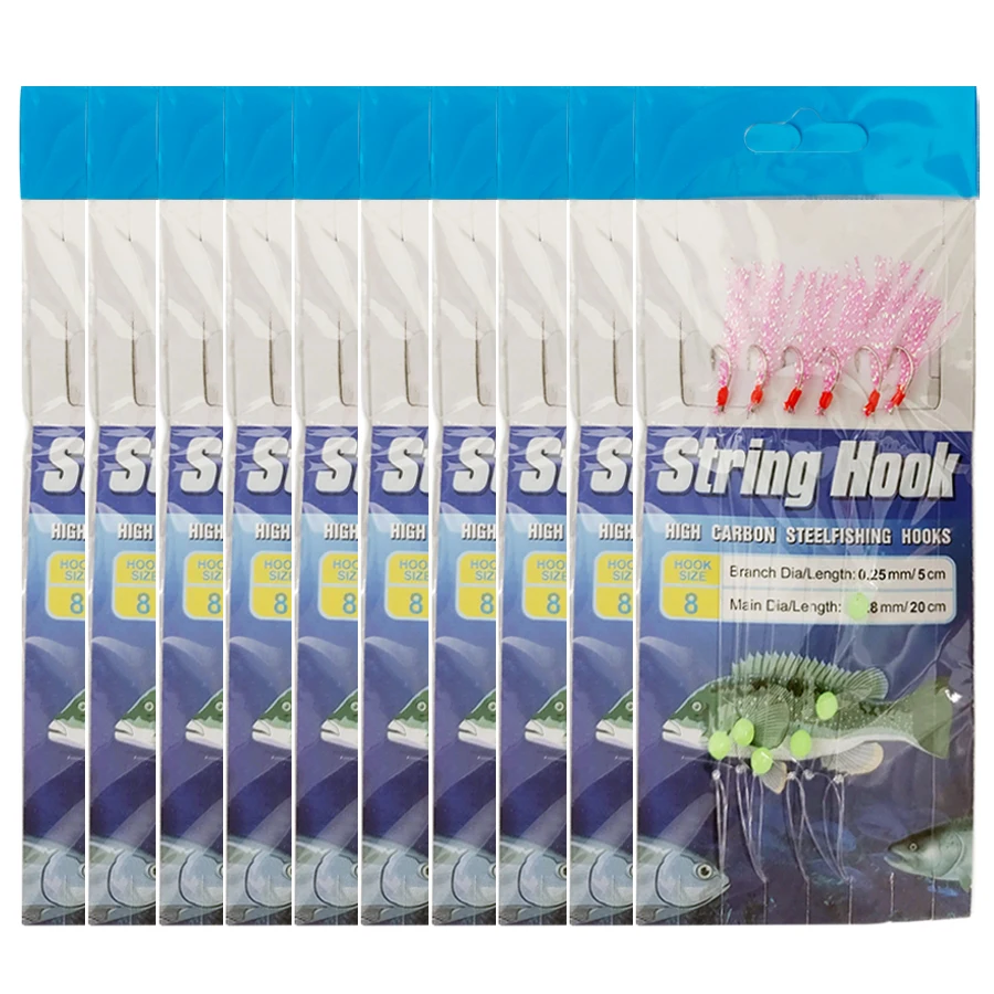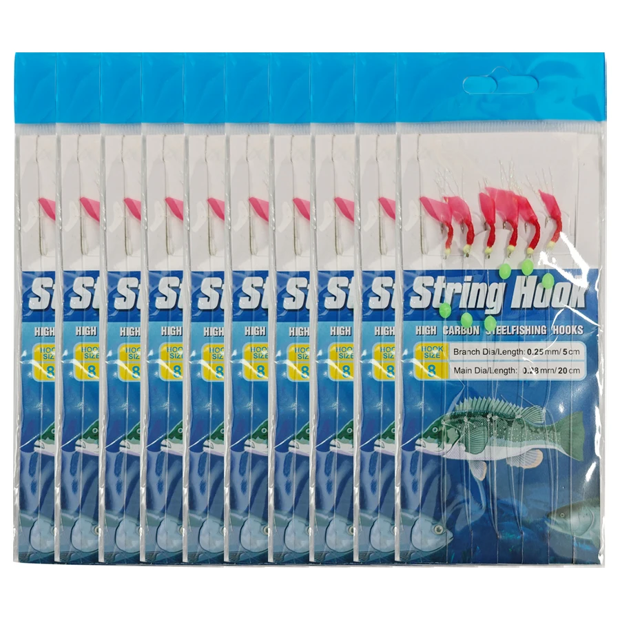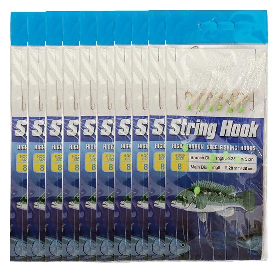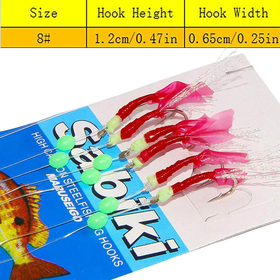 Paquete de 10 plataformas Sabiki 8# Equipos de pesca con cebo blando, anzuelos de pesca con frijoles luminosos Wobbler, aparejos que brillan en la oscuridad en agua salada con mosca oceánica