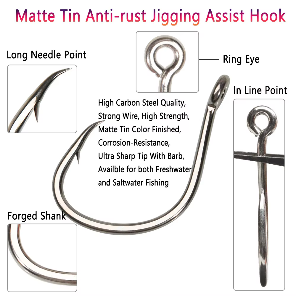 Bimoo 10PCS 1# Anzuelo de asistencia de Jigging antioxidante de estaño mate, anzuelos de agua salada de acero con alto contenido de carbono, anzuelo de señuelo con púas, 1/0 2/0 3/0 4/0 5/0