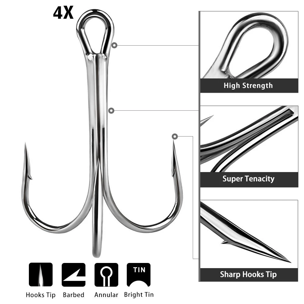 10 Uds 4X fortalece el gancho de estaño ORIGIN grande súper afilado 6/0 # -10/0 # Anzuelos de pesca triples para peces grandes, agua salada, acero al carbono, Peche