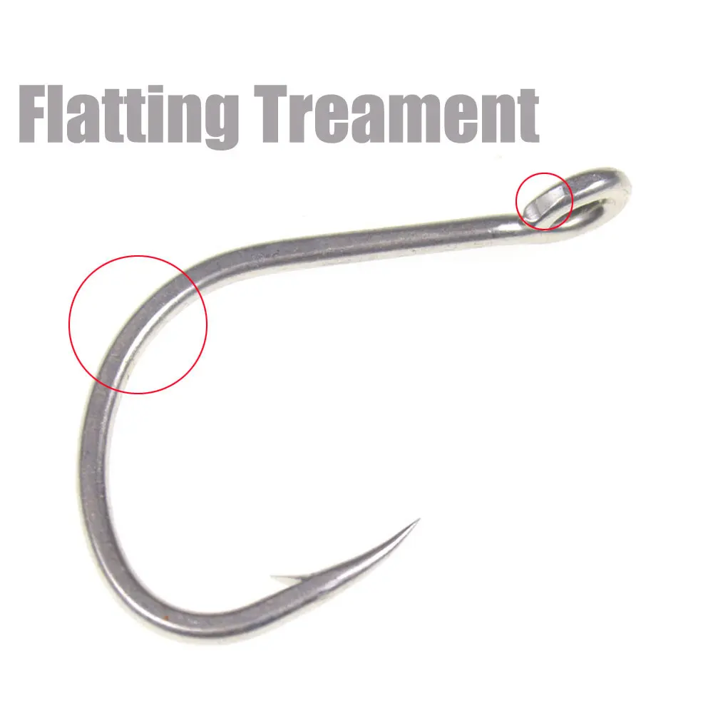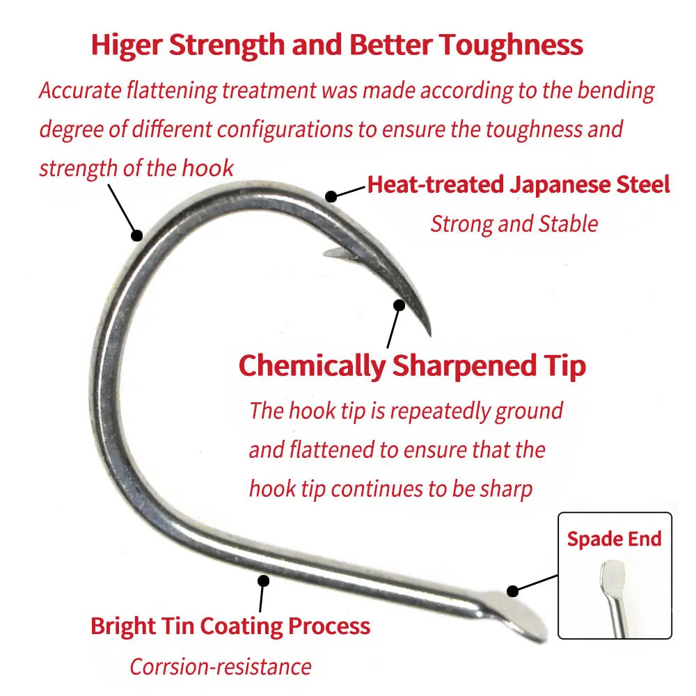 - Mayor resistencia y mejor tenacidad: para evitar que el anzuelo se enderece o se rompa después de capturar el pez grande, se realizó un tratamiento de aplanamiento preciso de acuerdo con el grado de flexión de diferentes configuraciones para garantizar la tenacidad y resistencia del anzuelo.