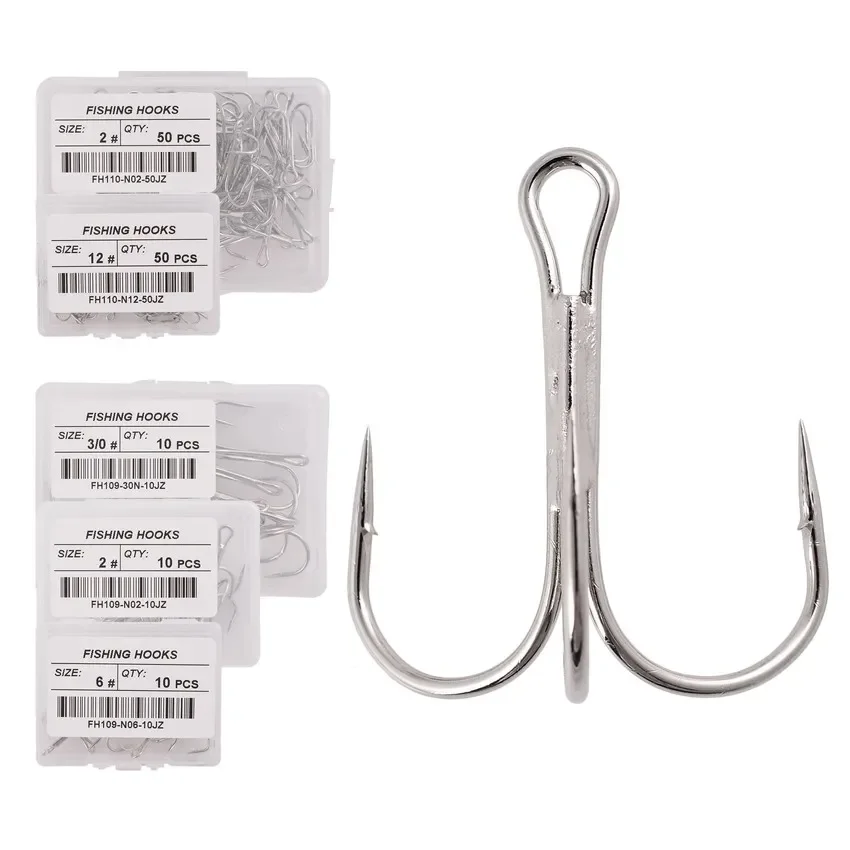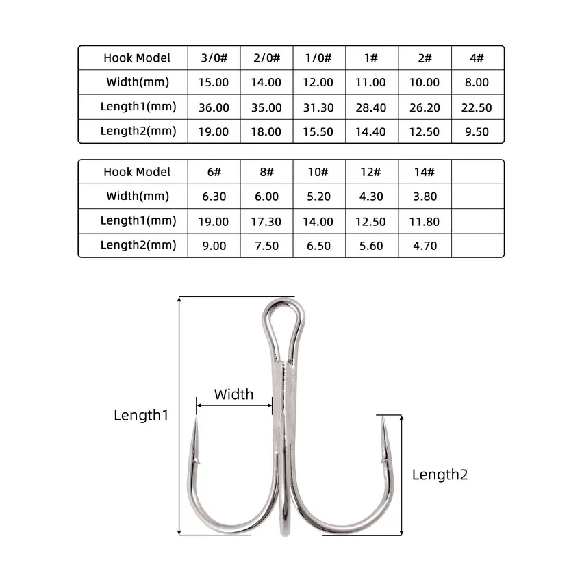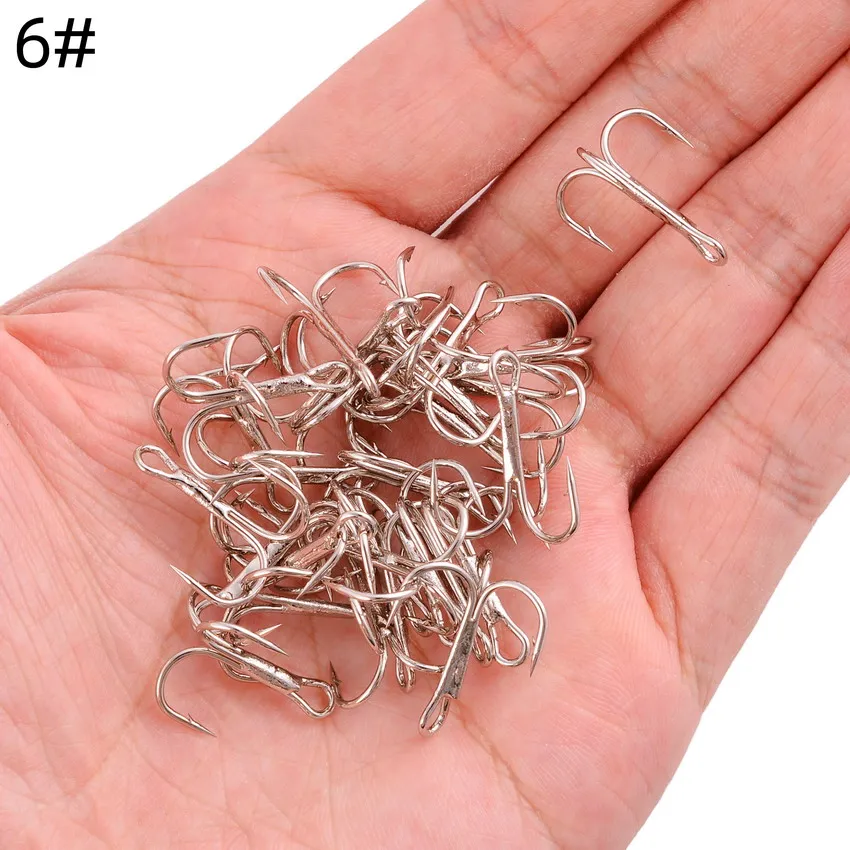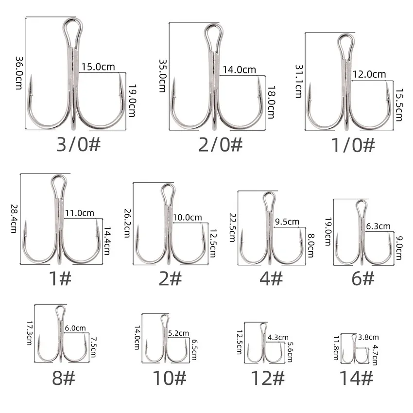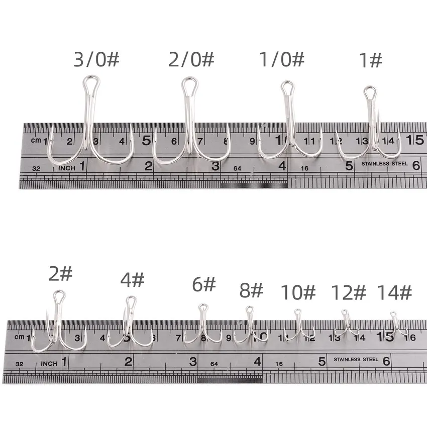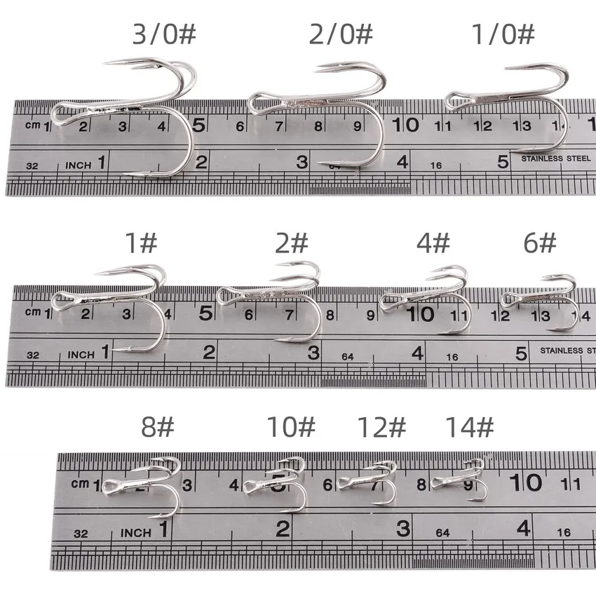 10 unids/lote 2 # -14 # 3/0 # Anzuelo de pesca plateado, anzuelos triples de acero rico en carbono, aparejos de pesca, triples curvados redondos para lubina