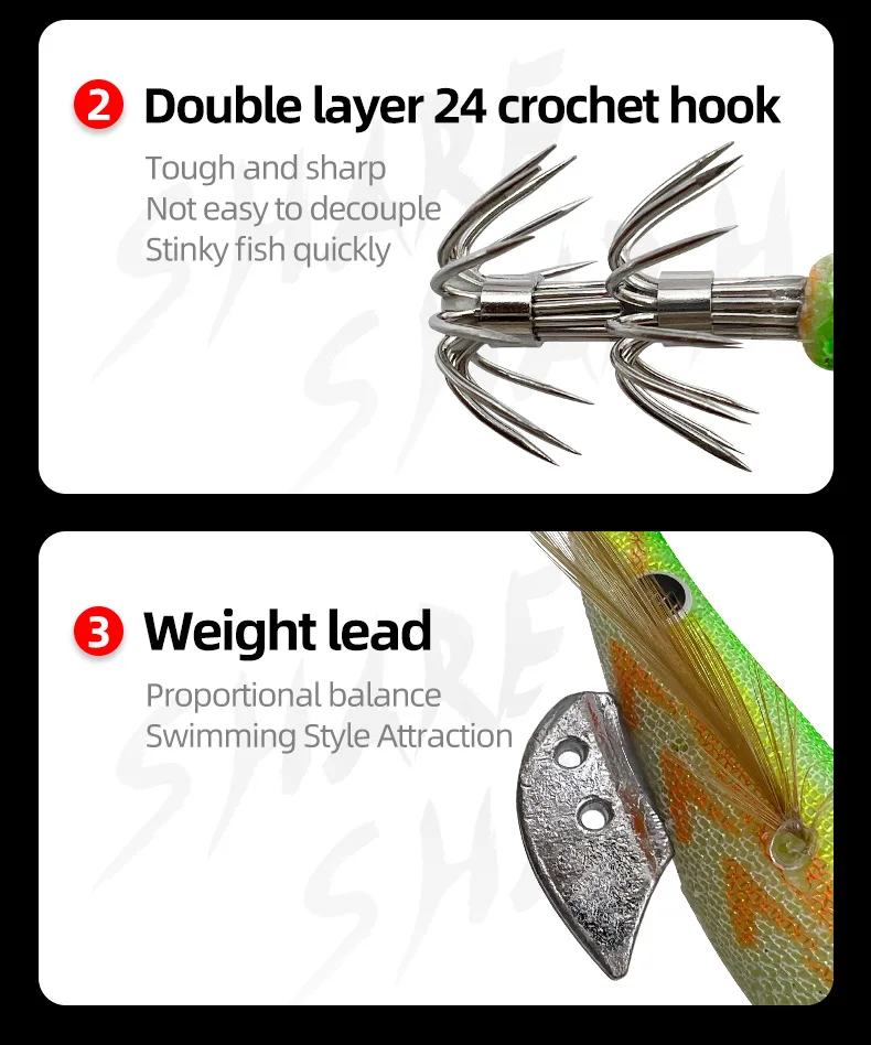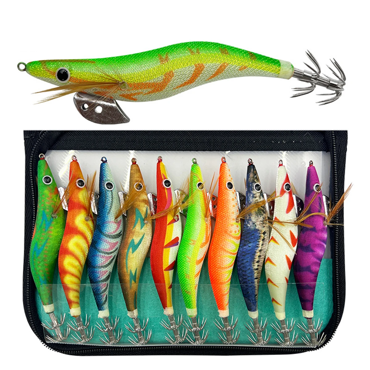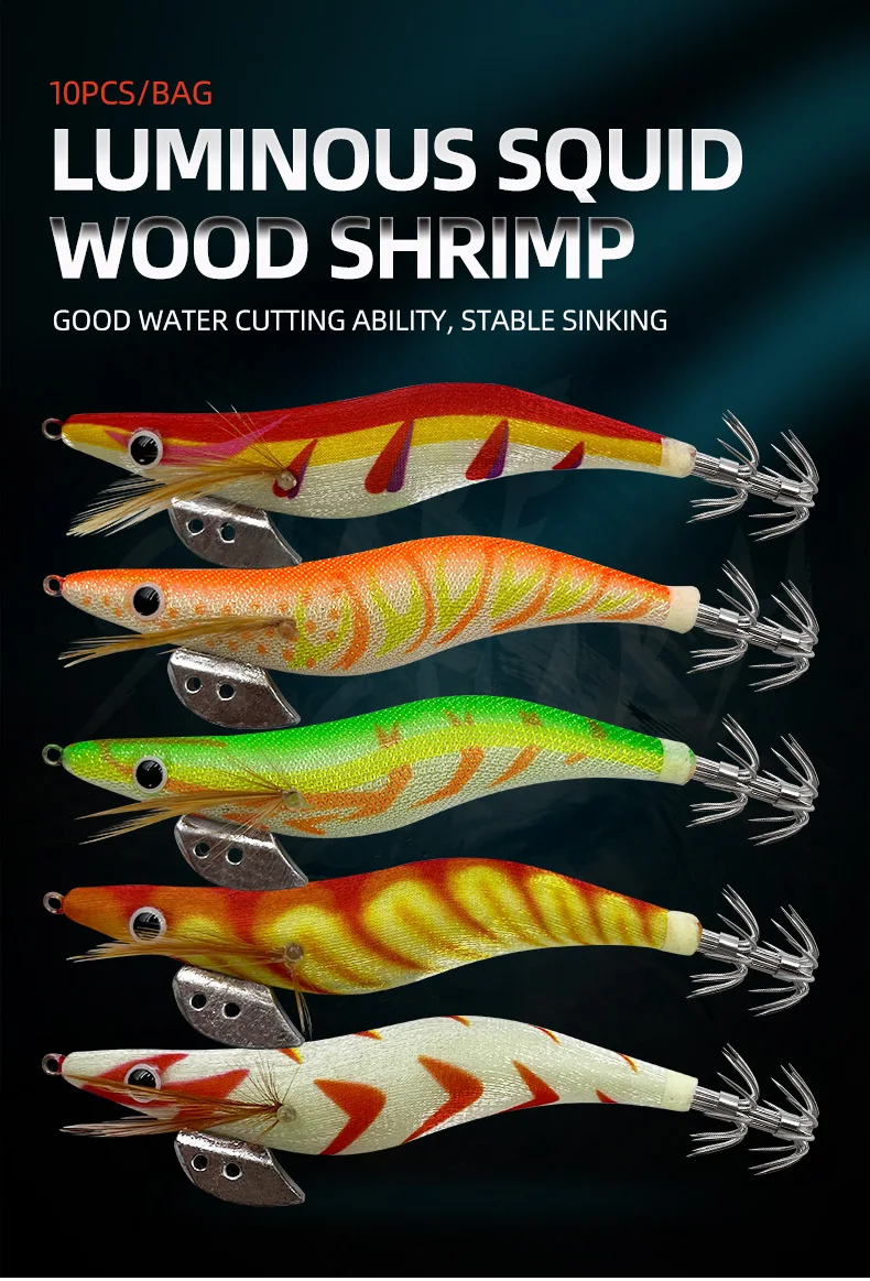 10 unids/lote anzuelo luminoso de calamar, cebo, camarón, pulpo, sepia, señuelo, plomo, camarón, cuenta con sonido incorporado, Señuelos de Pesca, plomo