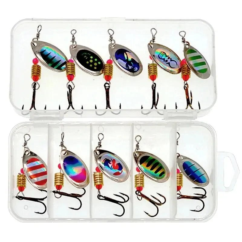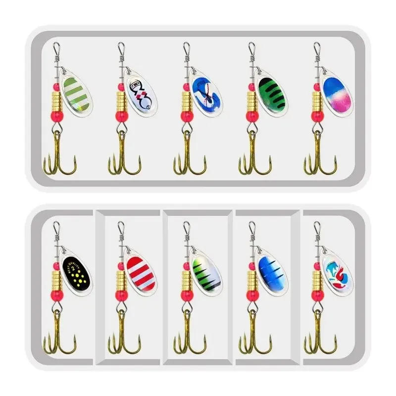 10 unids/set señuelo giratorio 10 colores con anzuelo triple cuchara de Metal señuelo de pesca duro con caja de aparejos de pesca