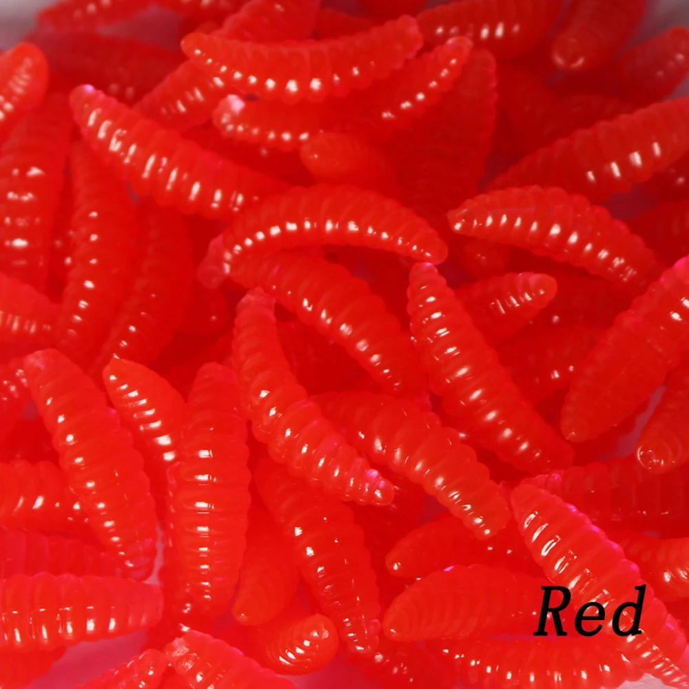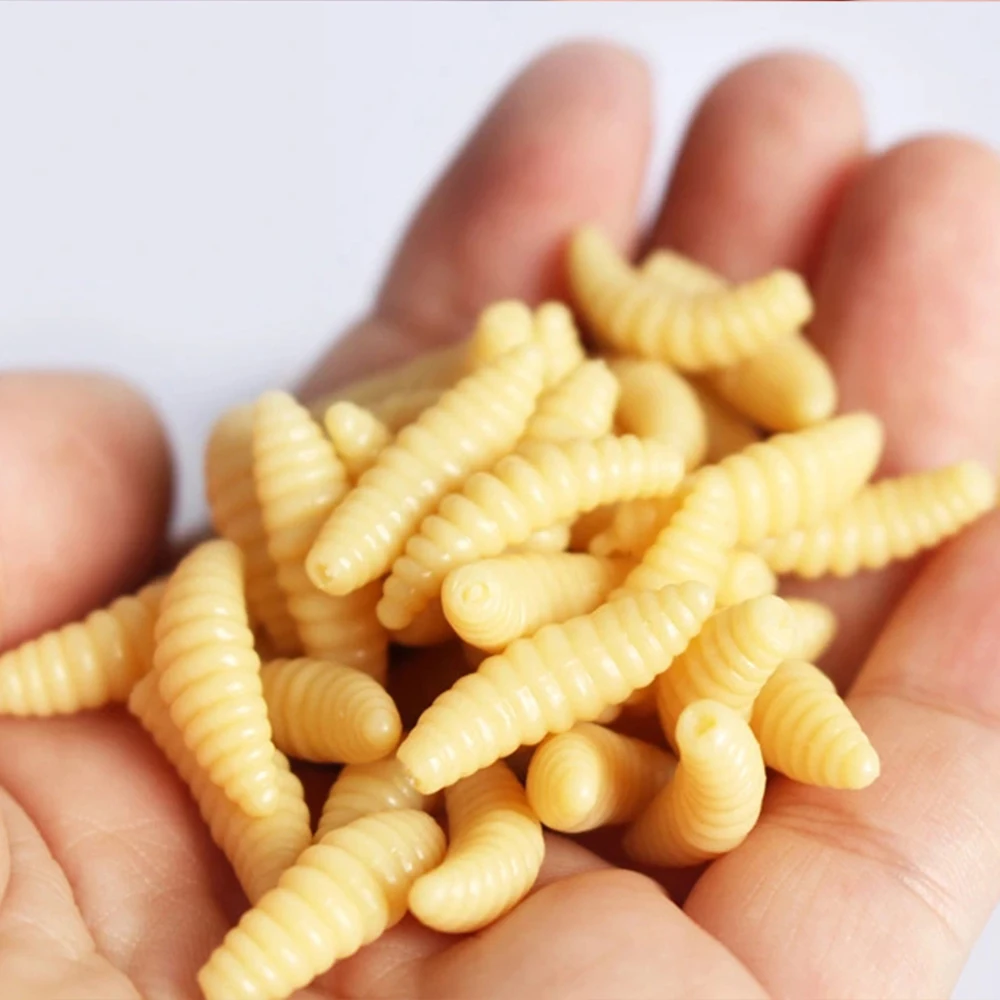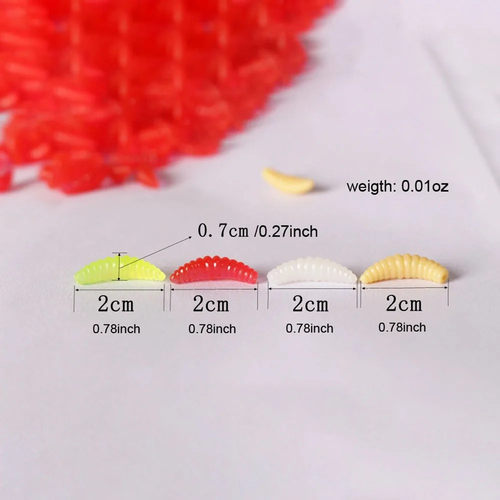 100/200 unids/bolsa 2cm pan gusano silicona cebos artificiales gusano larva suave señuelo de pesca ganchos biomiméticos olor gusanos resplandor de camarones
