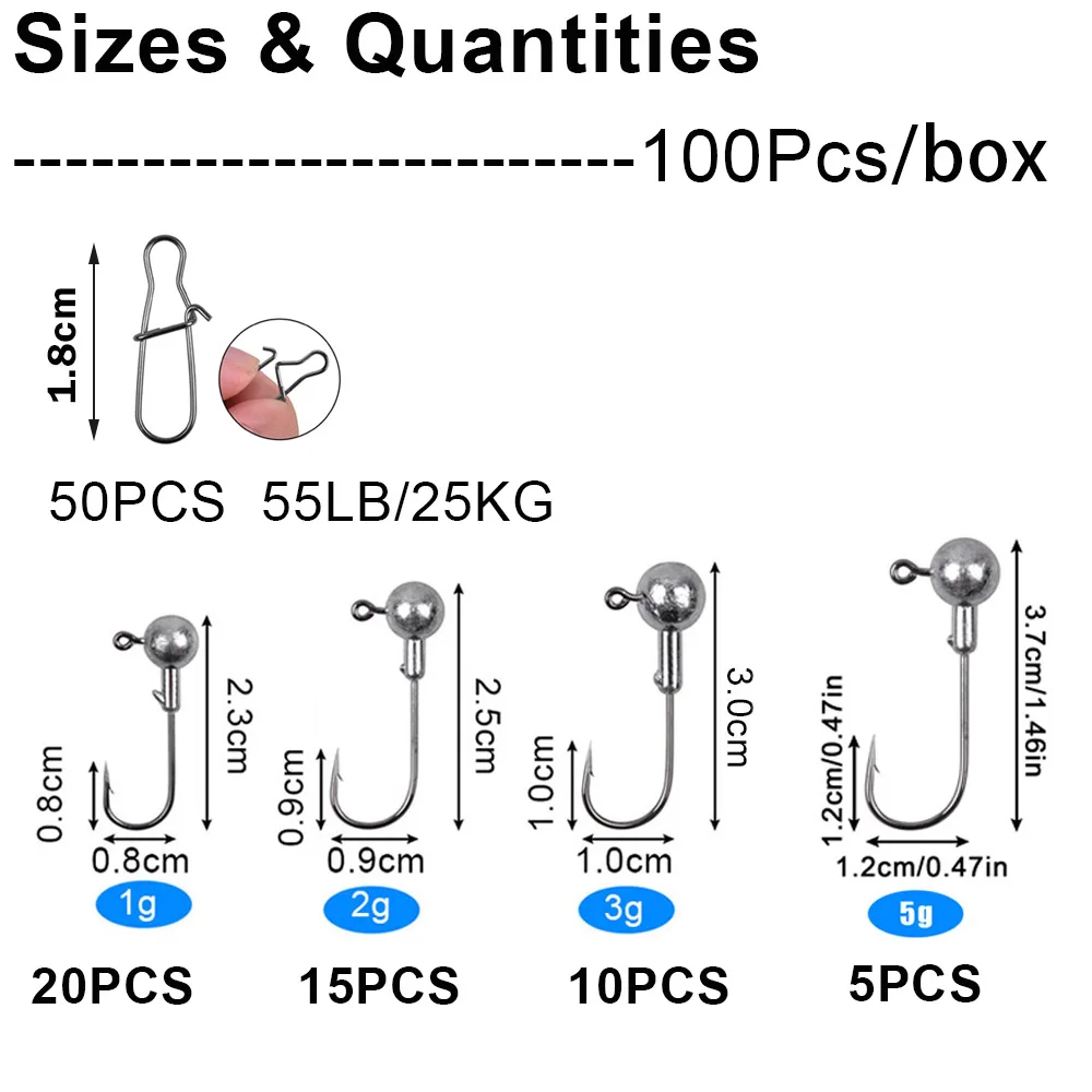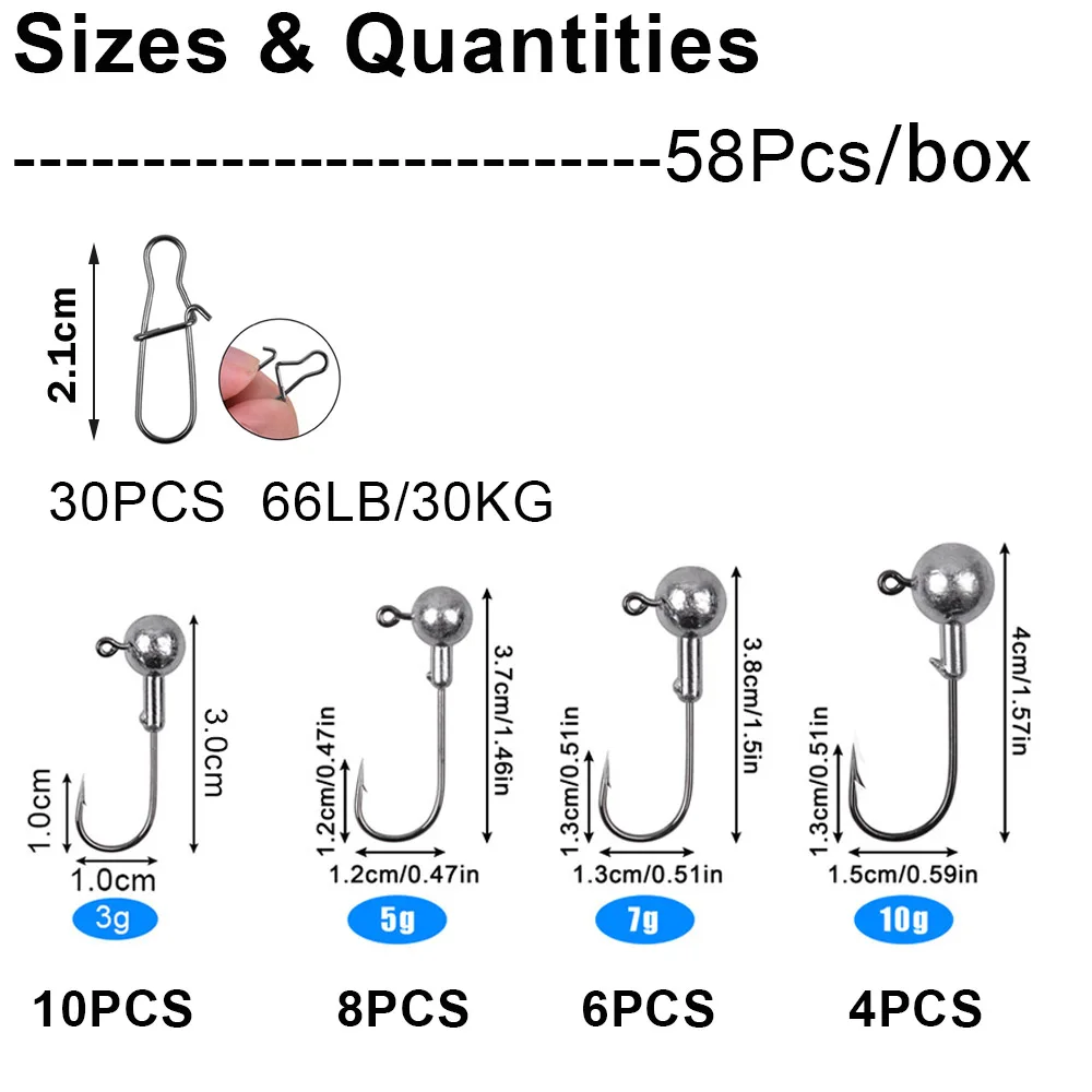 ---- 58PCS(Jig heads:3G 10Pcs, 5G 8Pcs, 7G 6Pcs, 10g 4Pcs, Snaps: 3 #30Pcs)