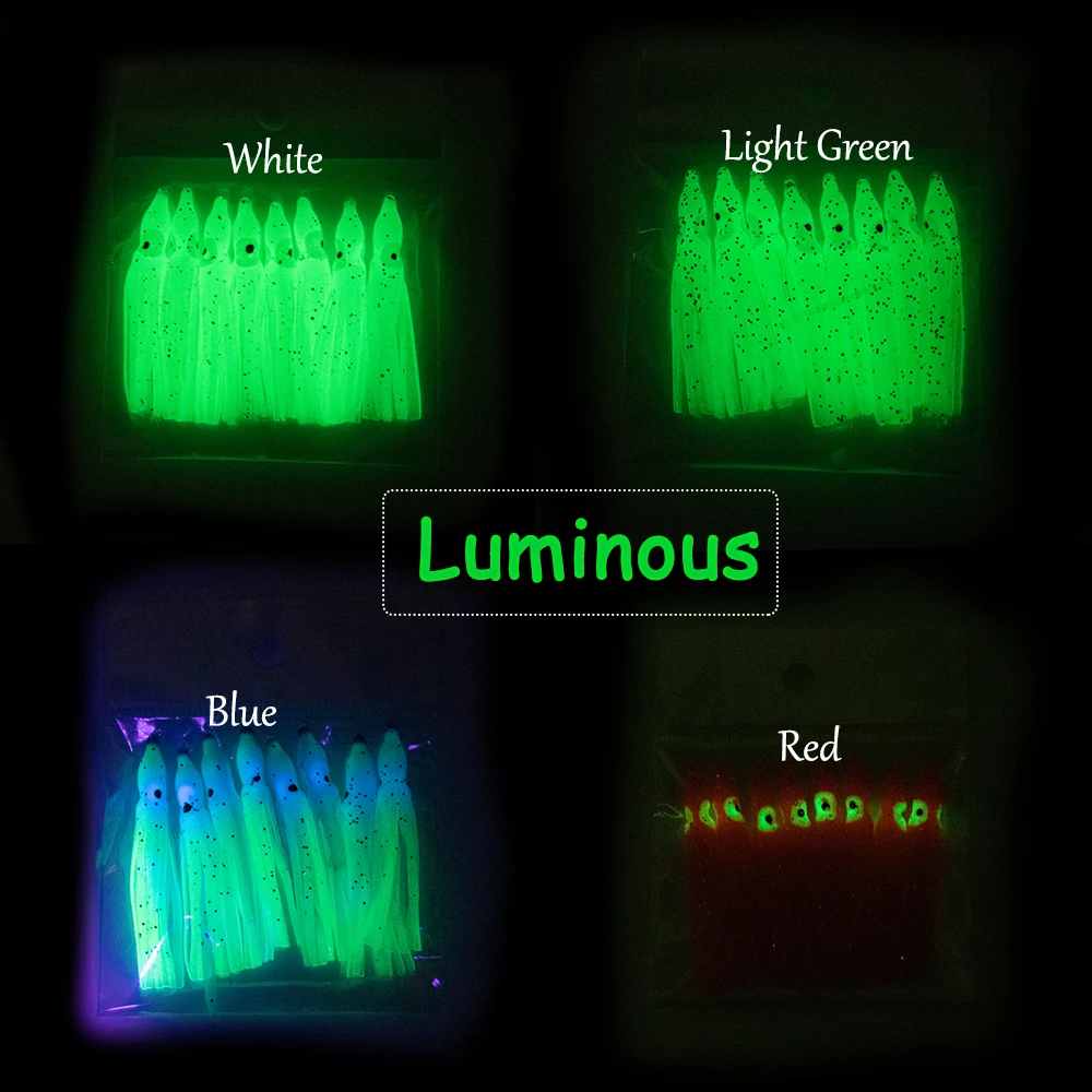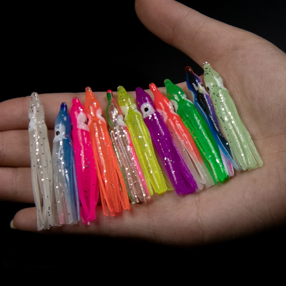 100 bolsas=800, 5cm, falda de calamar suave, señuelo, cebo de pulpo, señuelos, tubos de goma, aparejos de pesca de agua salada, venta al por mayor, mezcla de colores