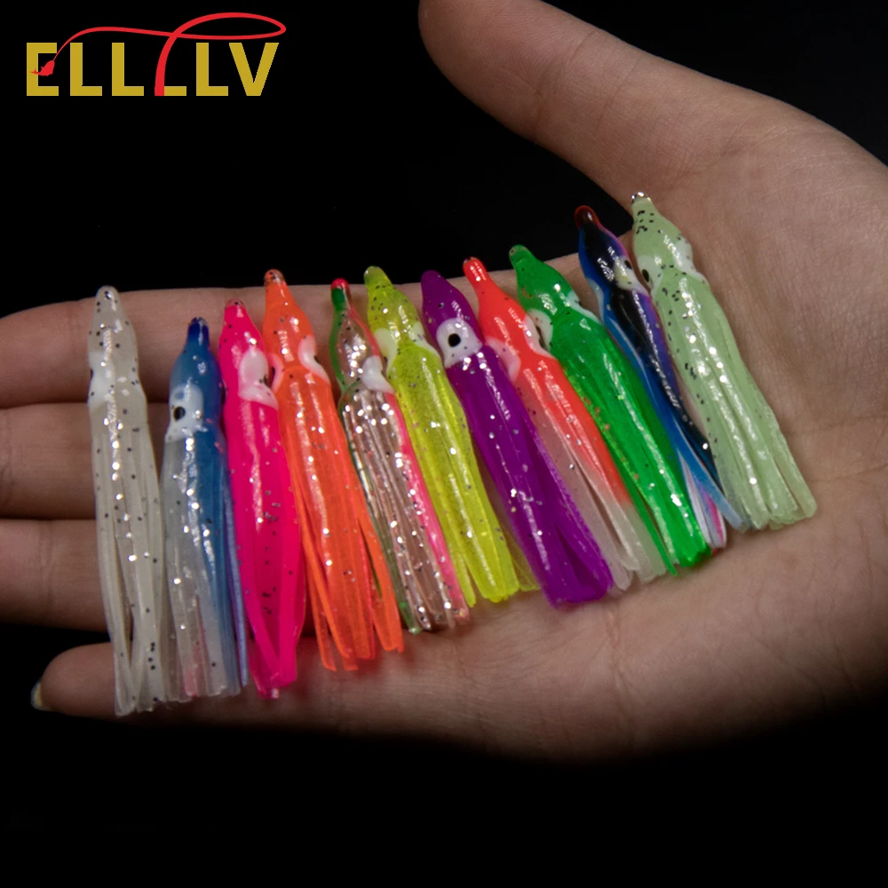 100 bolsas=800, 5cm, falda de calamar suave, señuelo, cebo de pulpo, señuelos, tubos de goma, aparejos de pesca de agua salada, venta al por mayor, mezcla de colores