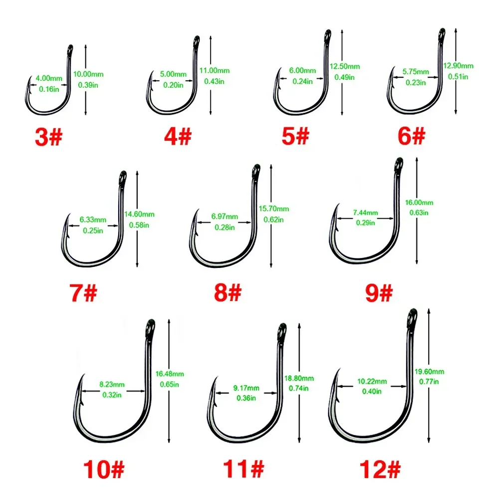 Información básicaCantidad: 100 Uds. Anzuelos de pescaMaterial: acero con alto contenido de carbonoTamaño del gancho: 3# 4# 5# 6# 7# 8# 9# 10# 11# 12#Característica100 anzuelos de pesca de diferentes tamaños a partir de 3# a 12#.Súper afilado y duradero, está fabricado en acero al carbono de alta calidad.