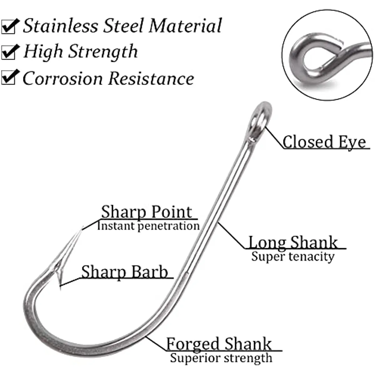 1.Acero inoxidable: anzuelos de pesca de agua salada hechos de revestimiento de acero inoxidable 420 para un excelente rendimiento contra el óxido, aptos para agua dulce y salada.