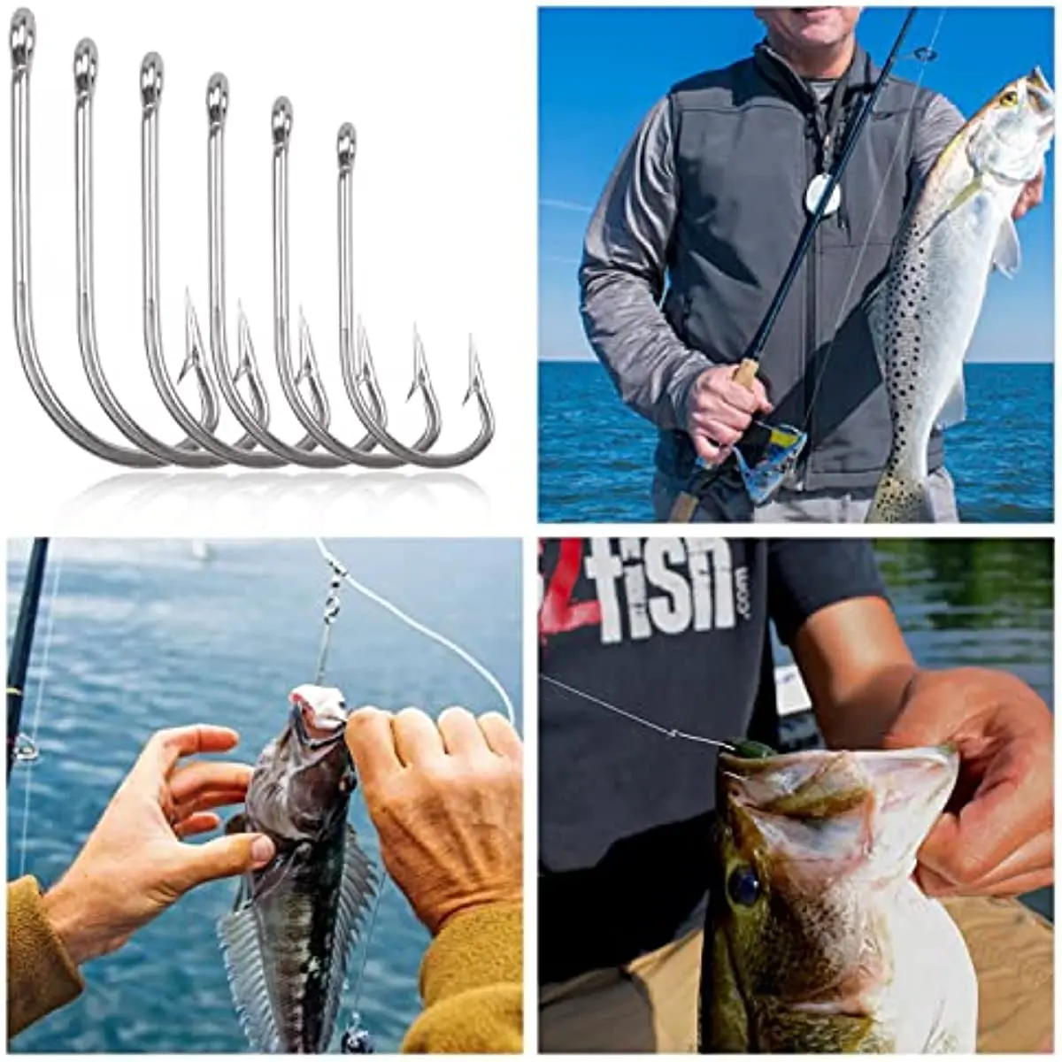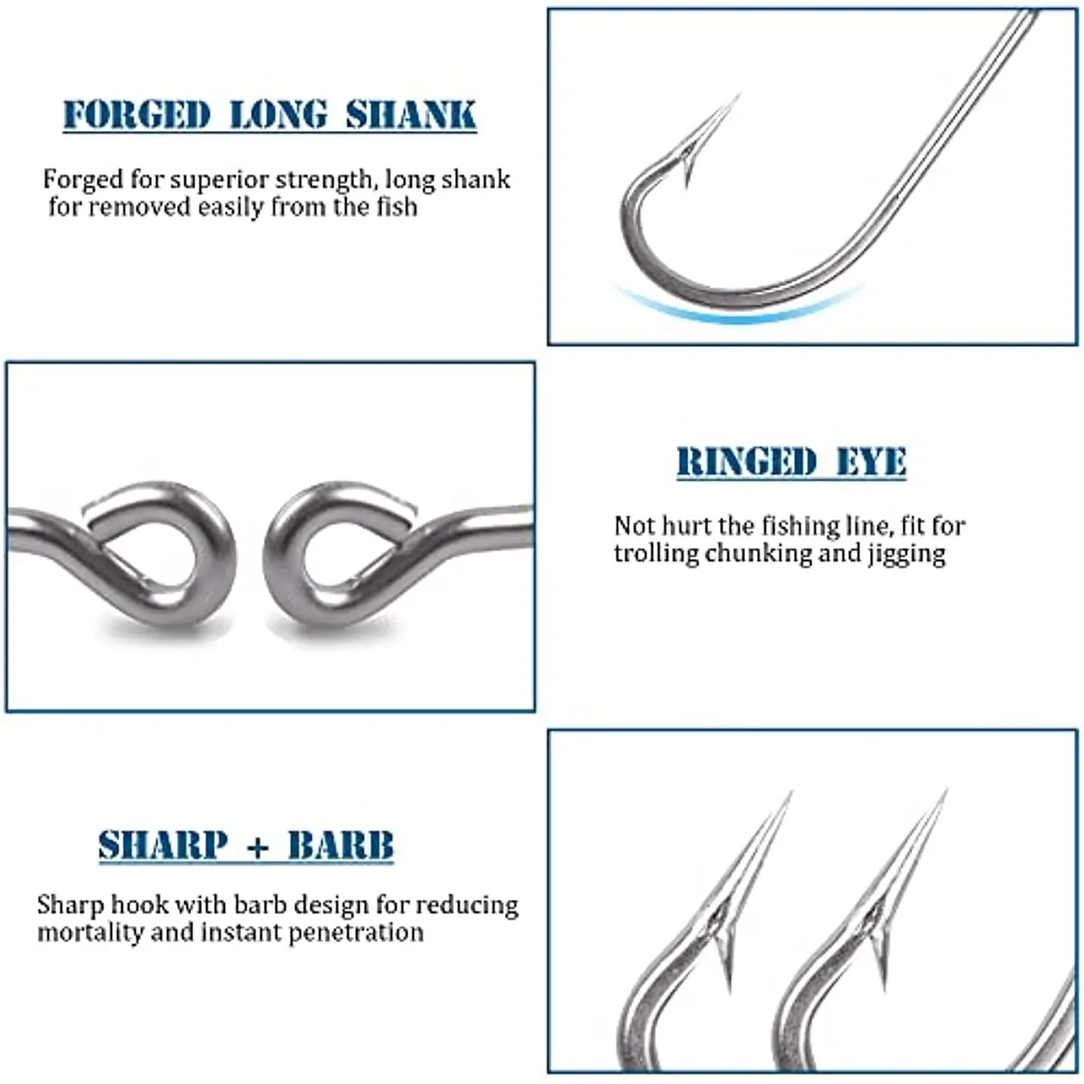2.Ganchos de agua salada: el ojo anular es perfecto para corraear, tropiezar o jigging.El vástago largo se puede quitar relativamente fácilmente de los peces.2 anzuelos estándar pesados, 1x largos para pesca en agua salada multiuso.