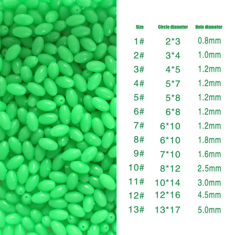 With center holefor fishing line In the luminous light effect is very strong, super flexible life longer, greatly reducing the resistance after the collision Quantity: 100pcs Color: Green 13 Sizes for option Color: Luminous Green 100PCS/Bag sizeCircle DiameterHole Diameter 1# 2*30.8mm 2# 3*41.0mm 3# 4*51.2mm 4# 5*71.2mm 5# 5*81.2mm 6# 6*81.2mm 7# 6*10 1.2mm 8# 6*10 1.8mm 9# 7*10 1.6mm 10# 8*12 2.5mm 11# 10*14 3.0mm 12# 12*16 4.5mm 13# 13*17 5.0mm Package Included: 100PCS Fishing Oval Floats Beads.