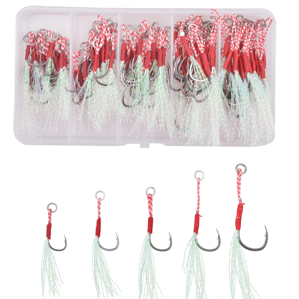 100 unids/caja anzuelo de asistencia de plantilla fundida señuelo de Jigging lento anzuelos de pesca de lubina anzuelo de púas atado anzuelo con pluma anzuelo de pesca de mar
