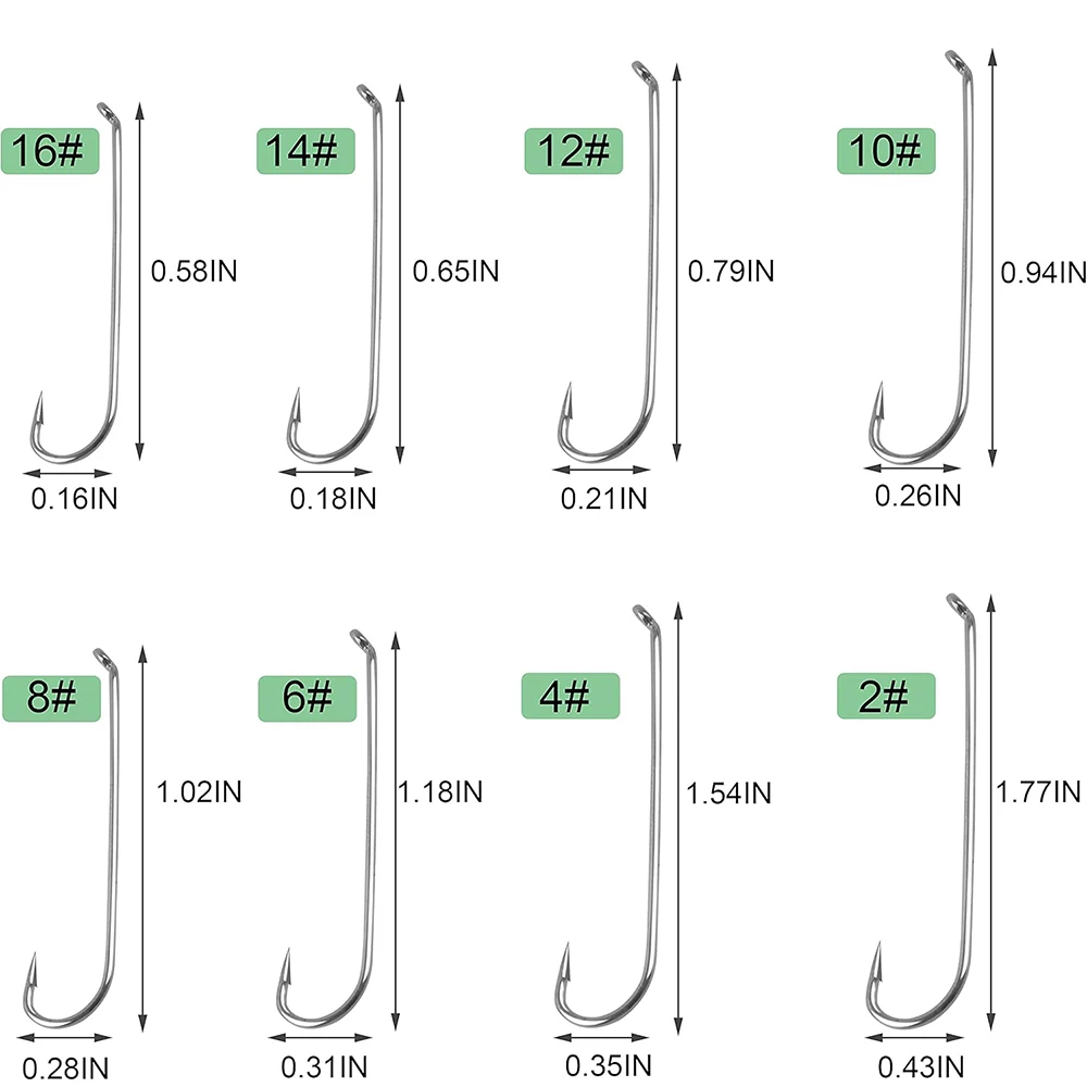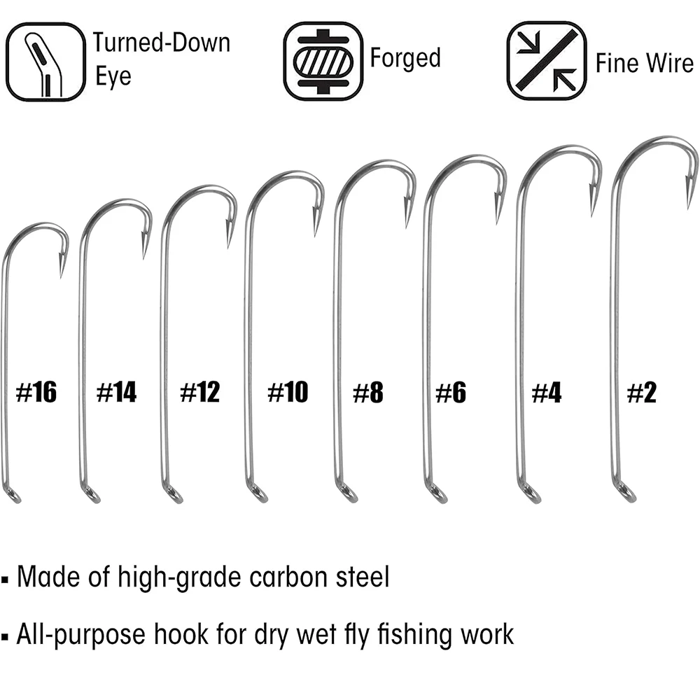【Característica de ganchos para moscas secas】 Forjado, ojo abajo, minibarba, alambre de tamaño estándar, vástago largo 1X, curvatura redonda, amplio espacio, punta químicamente afilada