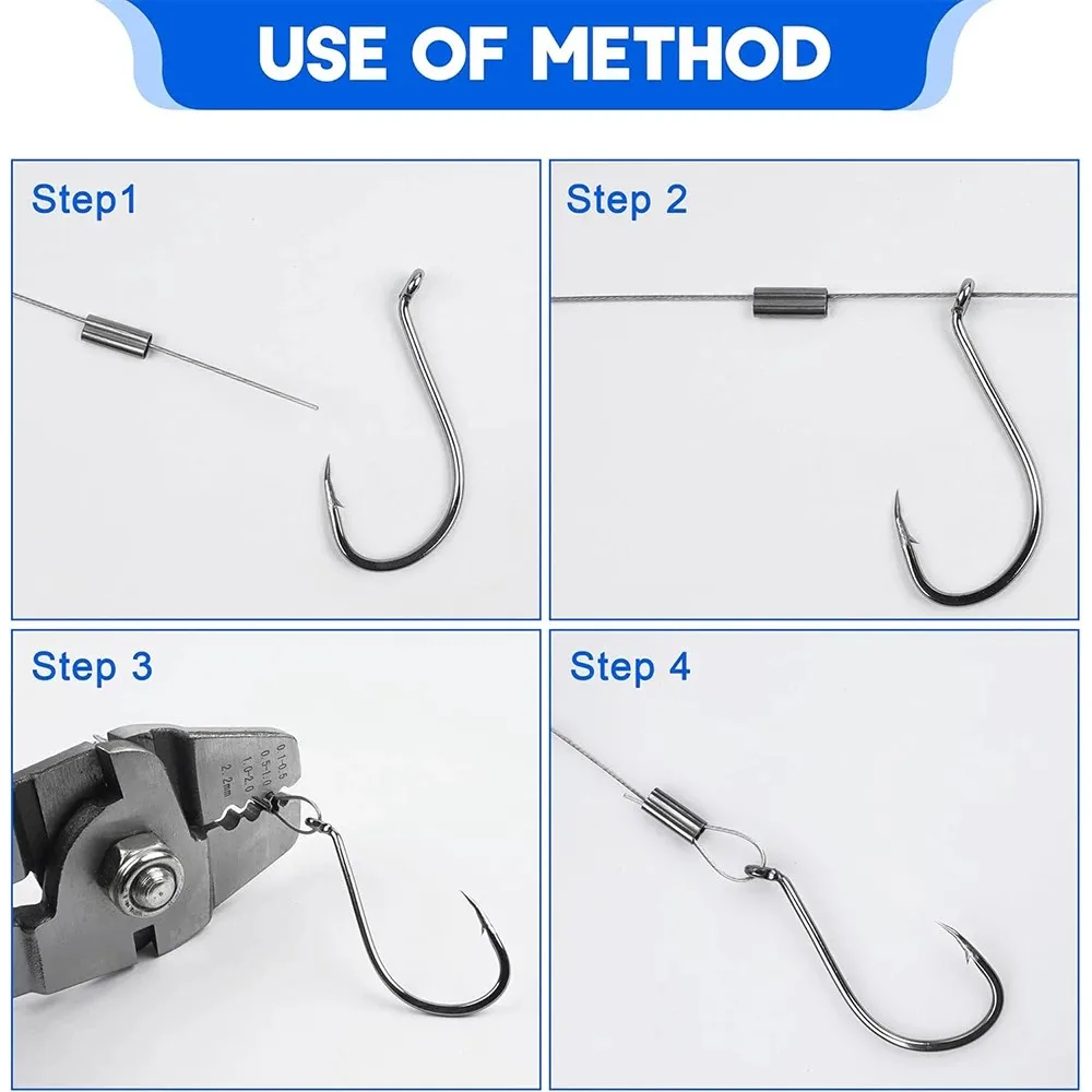 DISEÑO: Las mangas engarzadas para hilo de pescar están diseñadas con doble orificio, que es fácil de usar.Simplemente bloquee ambos extremos del cable guía con un tornillo de banco, unos alicates o herramientas de compresión.