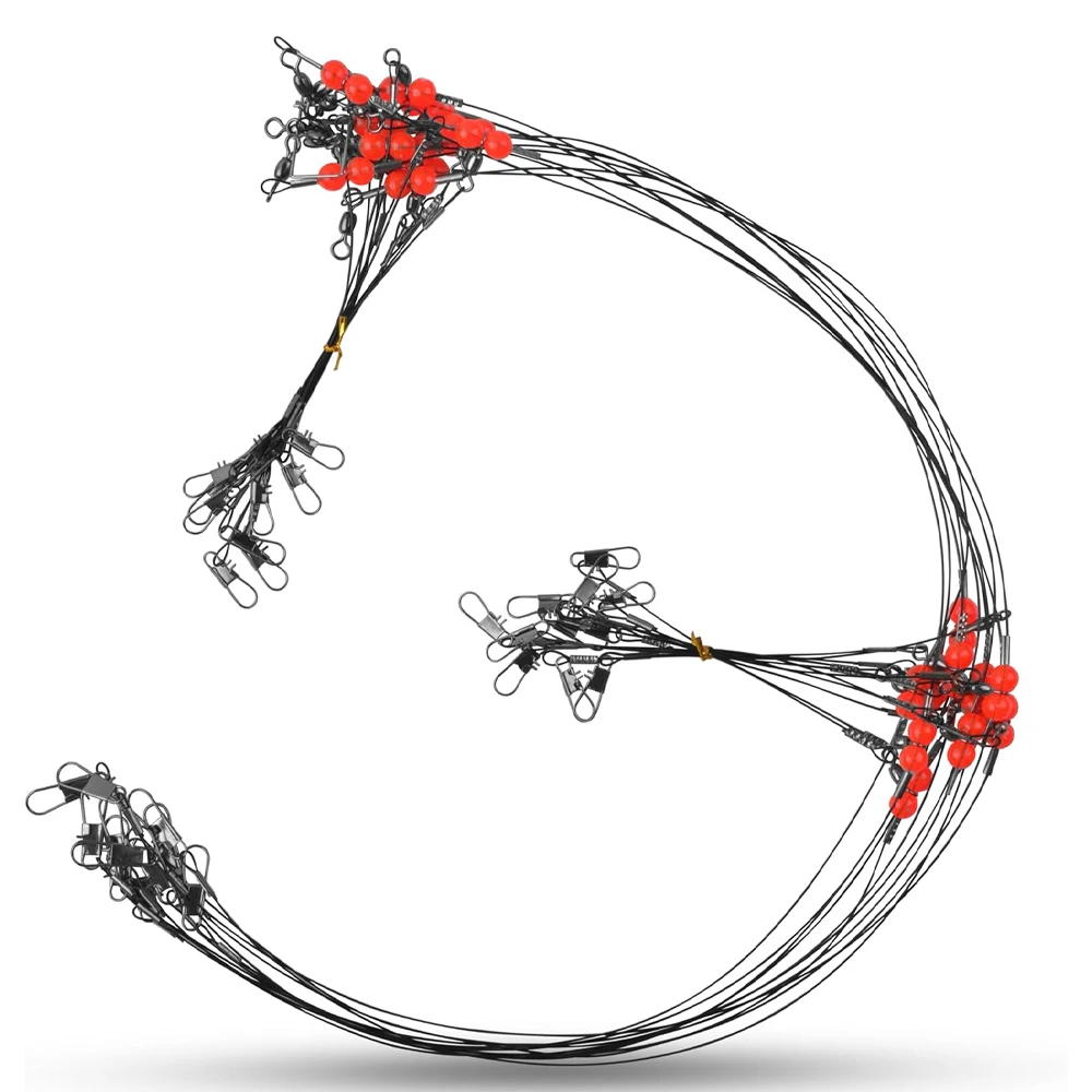 1. 12PCS stainless steel fishing wire leaders with 1arm / 2 arm, equipped with snaps, swivels and red beads.