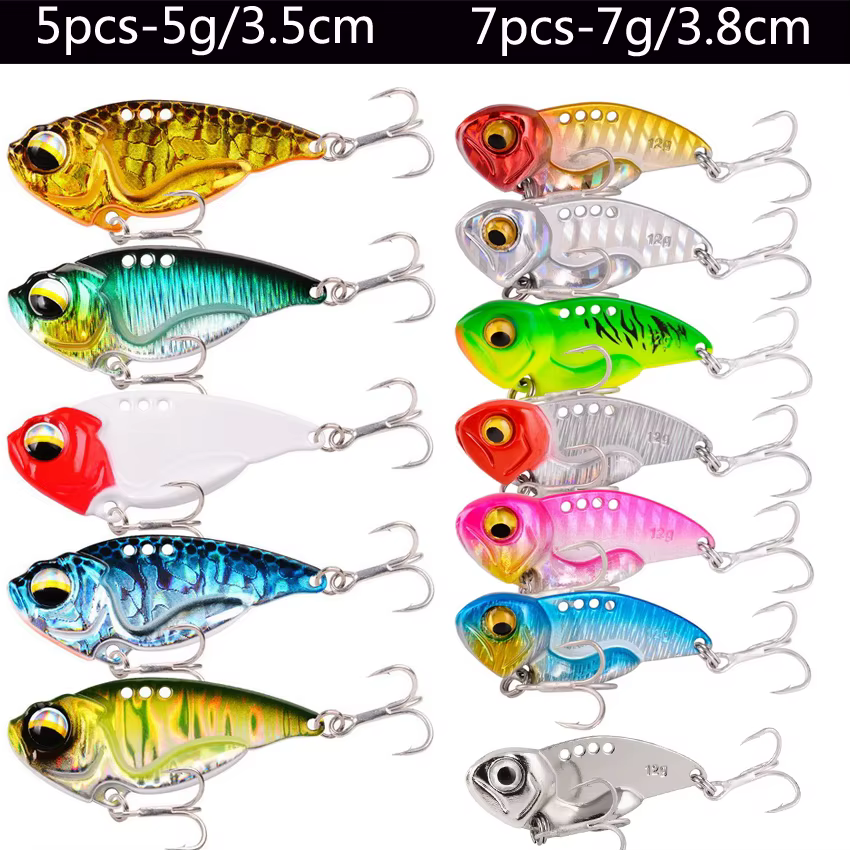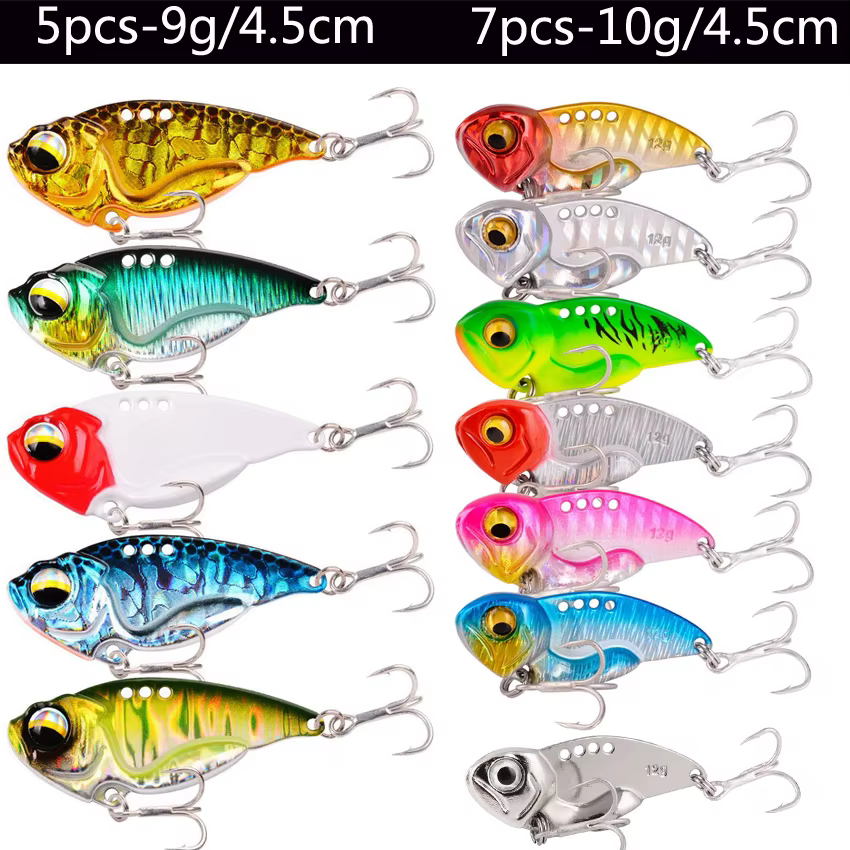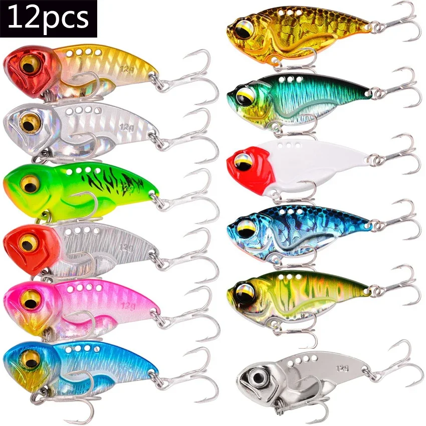 12 Uds Señuelos de Pesca cuchara de cebo VIB de Metal para Lucio 5g 7g 10g 12g 14g con anzuelo triple cuchara Wobble cebo duro Vib aparejos de pesca