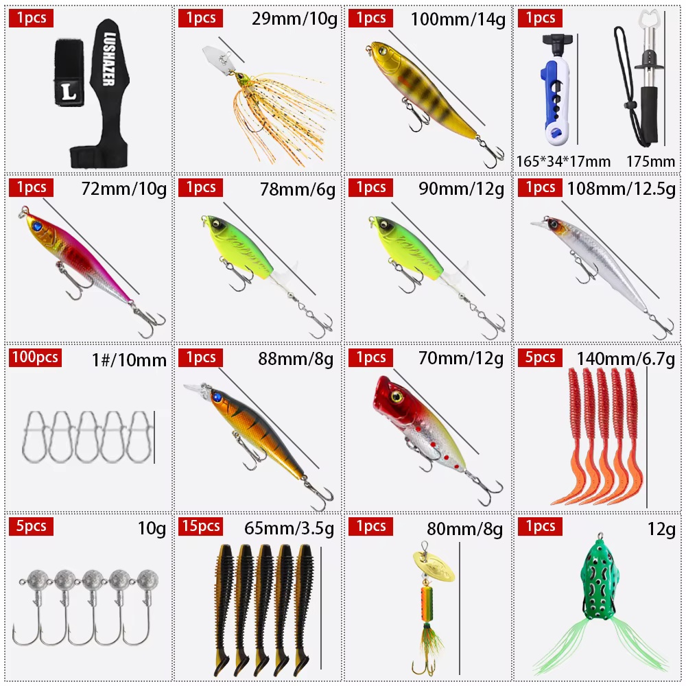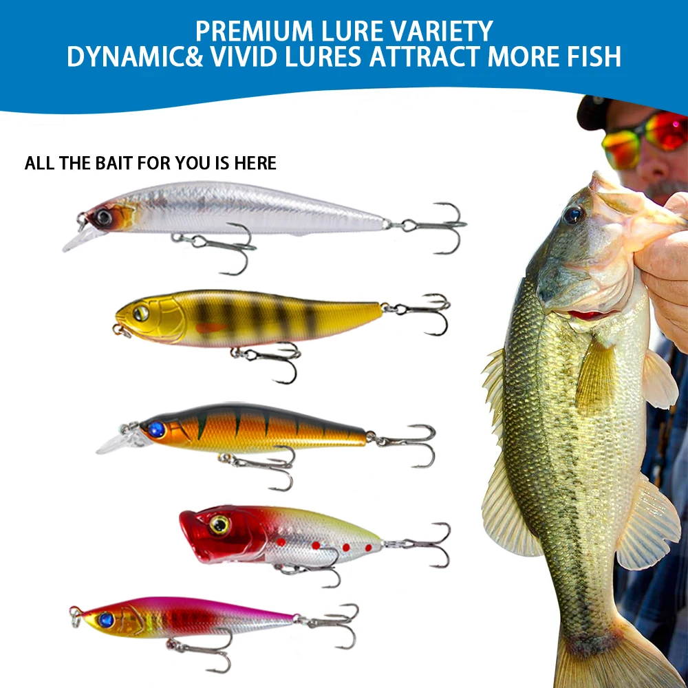 2. Selección diversa de cebo: nuestra caja de calendario de cuenta regresiva de pesca le proporciona varios tipos de cebos como poppers, lápices, pececillos, cebos de manivela, VIB, señuelos de rana y cebos de camarones, asegurando su éxito en cualquier condición de pesca.No importa el entorno, nuestro versátil conjunto garantiza que tenga las herramientas perfectas para atraer la captura que desee.