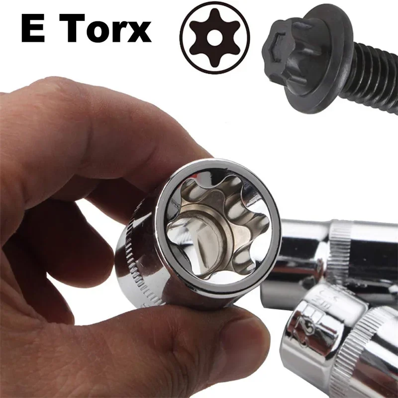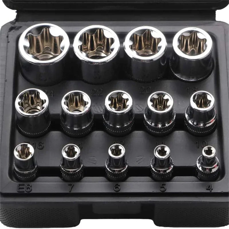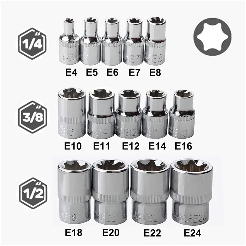 Juego de 14 piezas: 5 casquillos de accionamiento de 1/4" E4, E5, E6, E7, E8; 5 casquillos de accionamiento de 3/8” E10, E11, E12, E14, E16; 4 casquillos de accionamiento de 1/2” E18, E20, E22, E24.