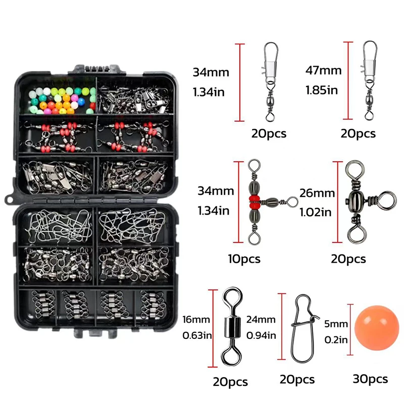 Viene con una caja de pesca, 140 accesorios de pesca están incluidos en la caja, como anzuelos de pesca, pesas de plomo, flotadores, láminas de plástico, broches, giratorios, tope de bobber, toboganes de plomo, manguitos de engarzado, etc.