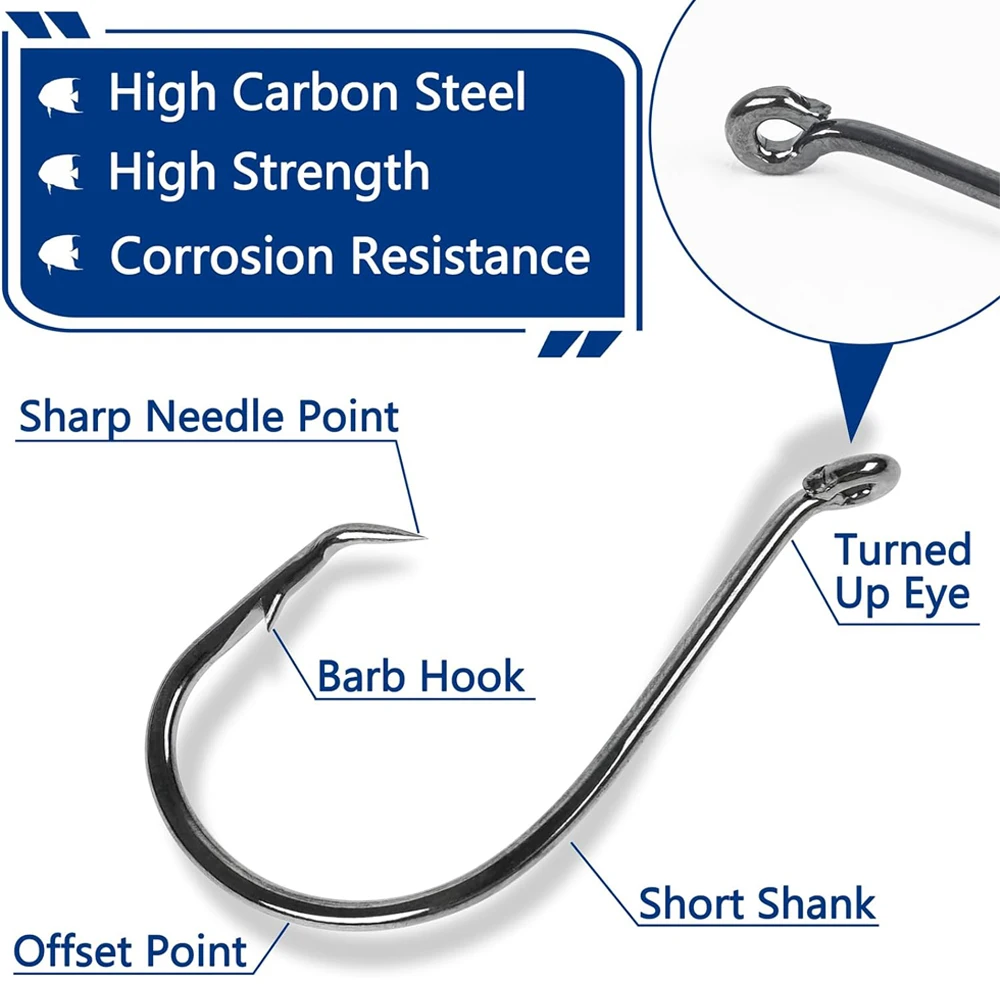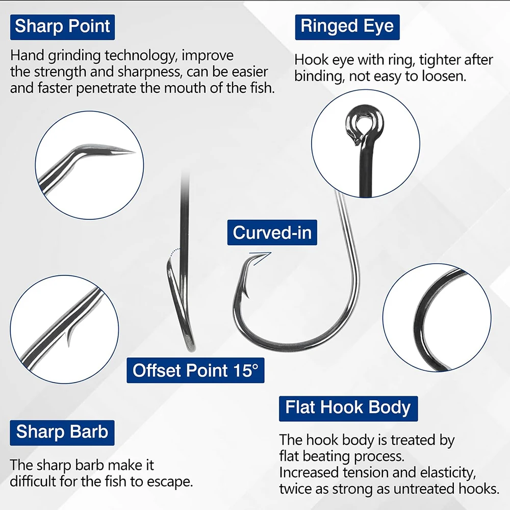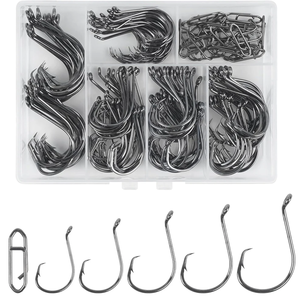 2. Este anzuelo es adecuado para diversos entornos de pesca. Y los anzuelos de pesca a granel son adecuados para varios tipos de aparejos y cebos, como señuelos artificiales, gusanos, maíz y cebos vivos. Anzuelos circulares de agua salada adecuados para atún, herrumbre, pulpo, lubina, lucioperca, trucha, salmón, pez el sol, bagre, etc.